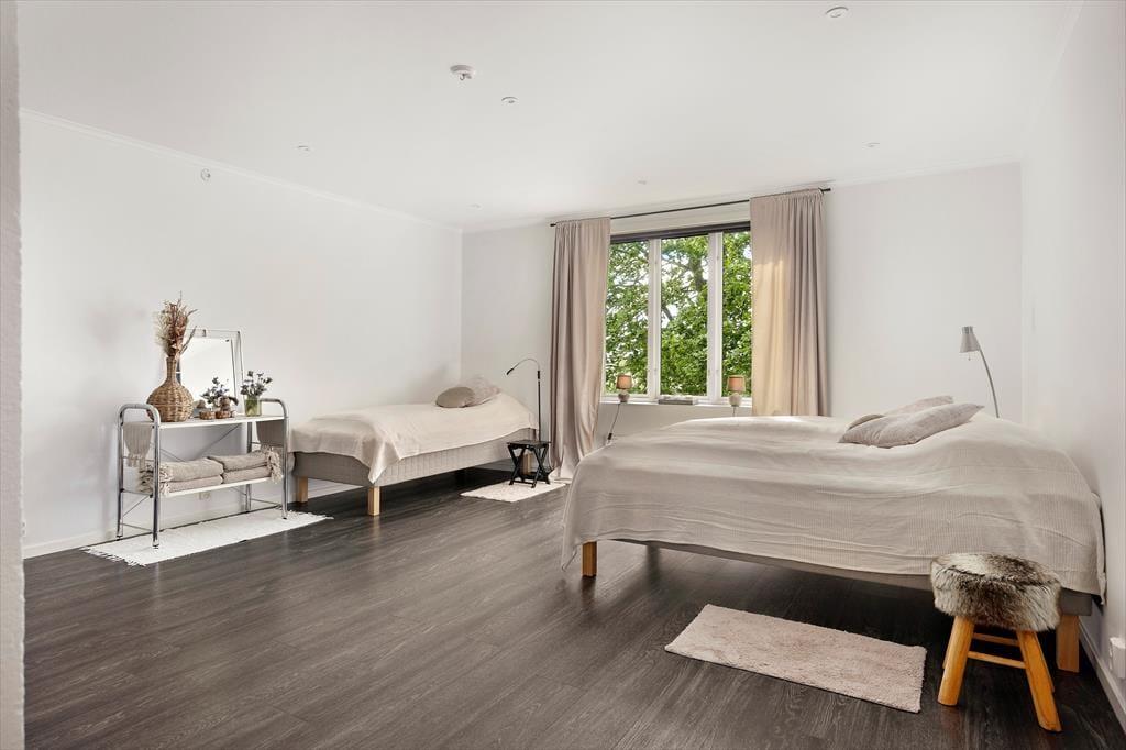 På overetagen ligger også husets store soveværelse, det »beige værelse«, som har tre 90 cm brede senge, hvoraf to kan skubbes sammen til en dobbeltseng. I den ene ende af værelset er der et stort loftsrum der kan bruges som walk-in-garderobe.