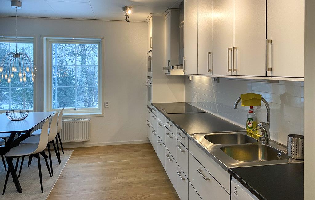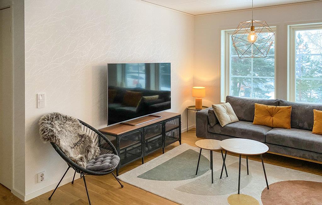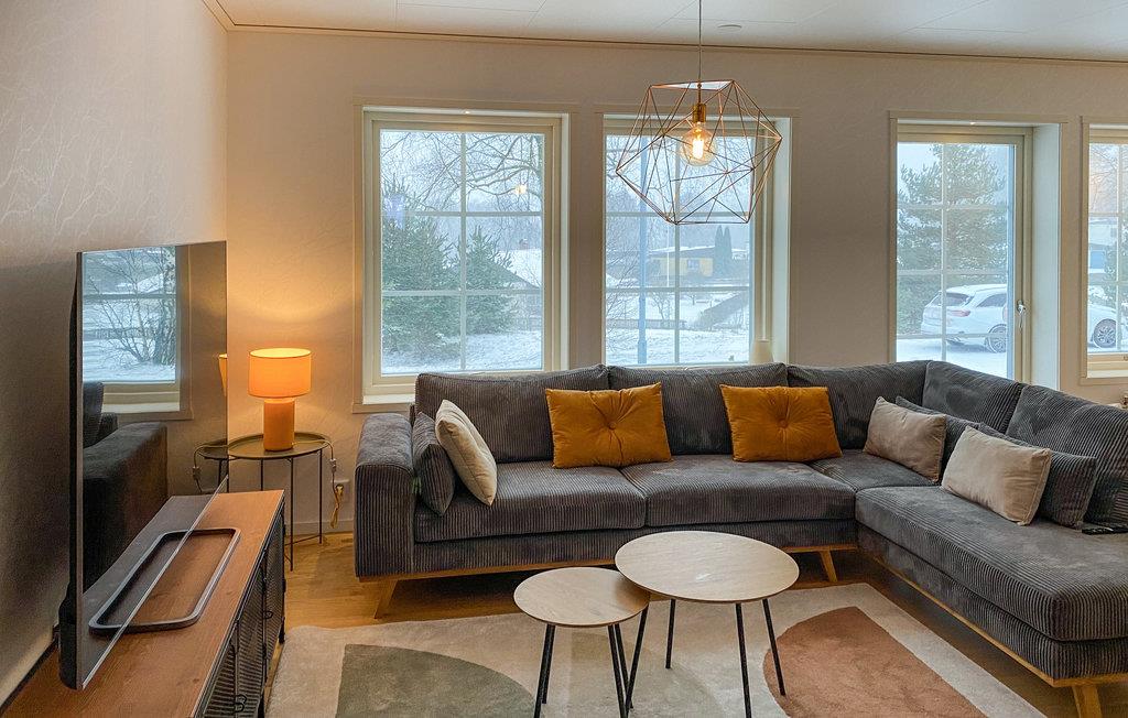 Kom og gør jer godt tilpas her! Den store stue er husets hjerte. Her kan I mødes i det komfortabelt indrettede opholds-, spise- og køkkenområde. Selv når I er i køkkenet, kan I deltage i samtalerne i sofaerne eller rundt om spisebordet og bruge tid sammen. Det moderne hus lader jer dvæle i sine lokaler, men tilbyder jer også en åben terrasse udendørs, hvor I kan finde jer tilpas med en kølig drink eller en grill.