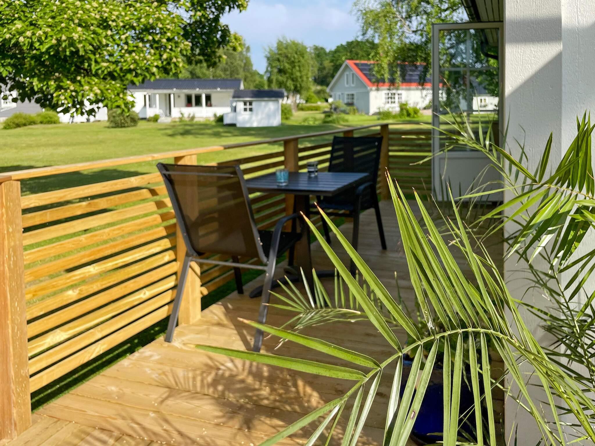 I husets entré finns klädhängare och bra utrymme för förvaring. Öppen planlösning i allrummet med köks del för egen matlagning, matbord att samlas kring och bäddbar soffa att mysa i framför tv:n. Skjutpartier avgränsar till sovrumsdelen med en dubbelsäng och en våningssäng. Badrummet med dusch, wc och tvättställ också välplanerat och rymligt. Från allrummet finns en altandörr ut på terrassen med havsutsikt. Trädecket som är ihopbyggt med ägarens hus ger en fin inramning på två av husets sidor och vid entren. Det finns ytterligare en uteplats med parasoll på husets framsida för den som vill variera sig med sol och skugga de varmaste dagarna. På baksidan av huset som ligger mot havet finns också tillgång till en stor gräsyta där lek och aktiviteter är möjliga.