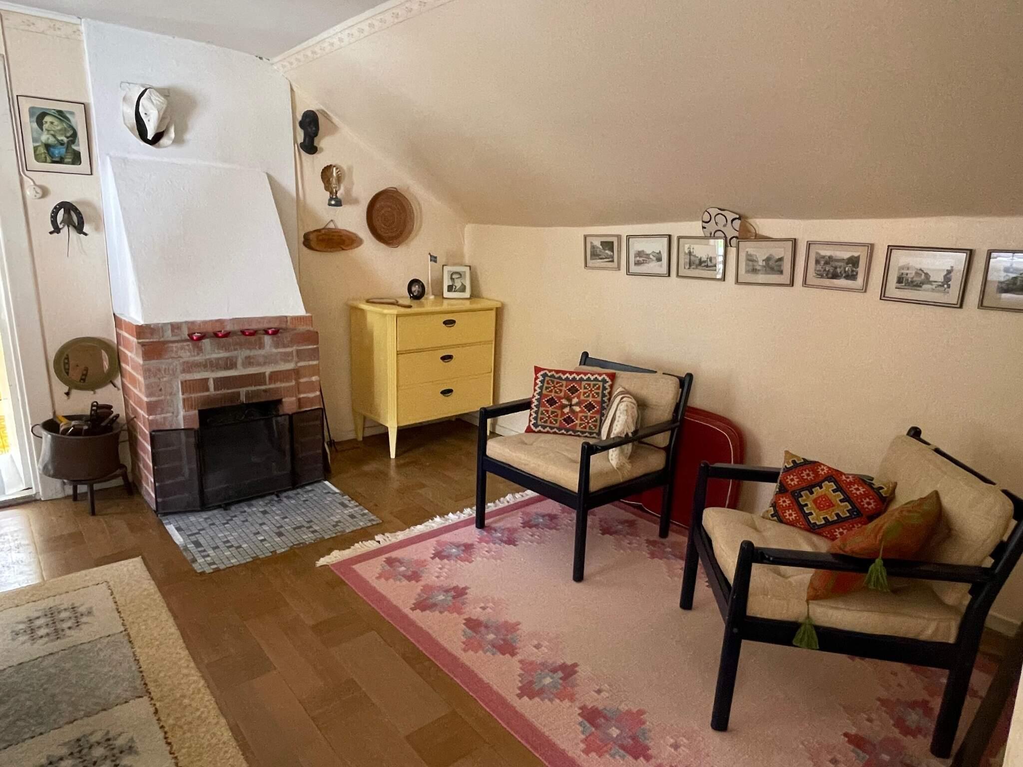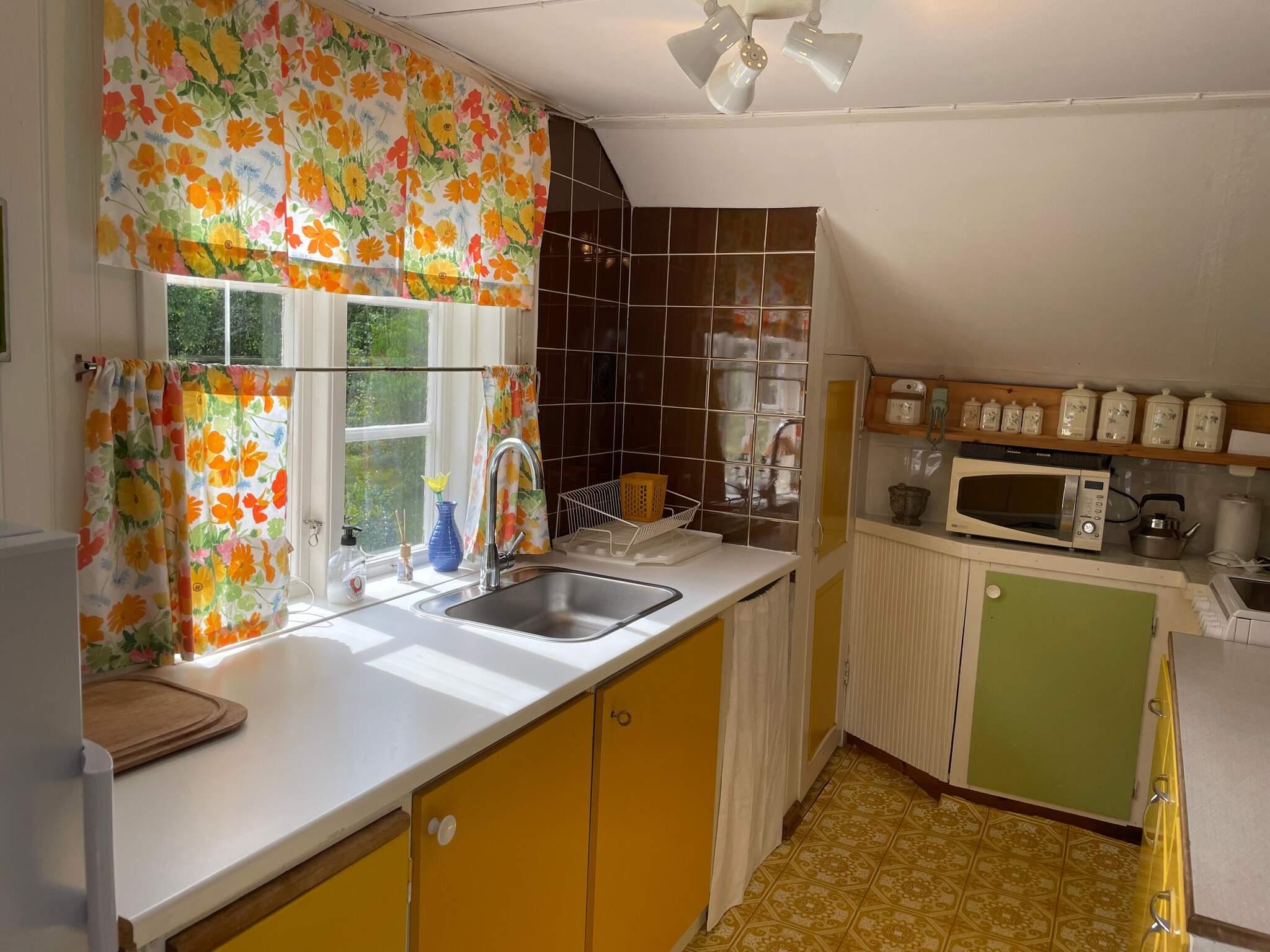 I entrén till stugan via uteplatsen kommer man direkt in i köket som ger möjlighet till bekvämt självhushåll. I det angränsande rummet finns matsalsmöbler framför en öppen spis som förhöjer mysfaktorn och ger skön värme. Vidare in i huset finns även en soffgrupp med tv som har grundutbudet av svenska kanaler. Från detta rum är det altandörr till uteplatsen med trallgolv. Innanför vardagsrummet finns ett sovrum med dubbelsäng och ett duschrum med handfat. I gästhuset på tomten finns ytterligare två sovrum. Det ena med dubbelsäng, det andra med våningssäng och en enkelsäng. Emellan dessa sovrum finns en toalett med handfat. Eftersom huvudbyggnaden är byggd i en vinkel så ligger terrassen väl skyddad med möjligheter till trevliga måltider och umgänge. Utemöbler och grill finns att tillgå på uteplatsen. Stor gräsmatta mellan husen för lek och aktiviteter eller för avslappnande semesterlata dagar i solen.