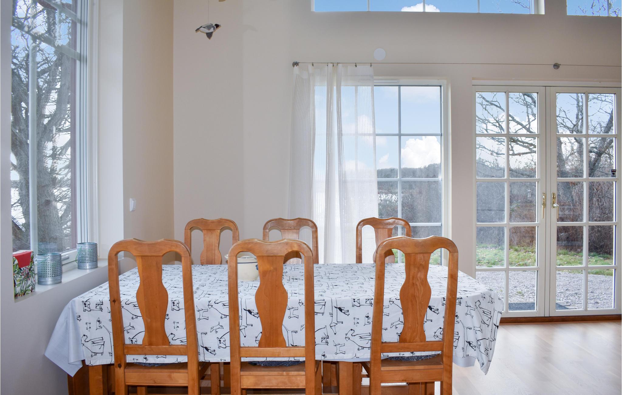 Velkommen til hele familien, som kan nyde dette smukke hjem ved vandet. De store vinduer i to etager oplyser hele opholdsrummet, hvor I samles for at lave mad, spise dagens måltider og spille spil. En vindeltrappe fører jer op til det hyggelige sofaområde, så I kan nyde udsigten til vandet fra begge etager.