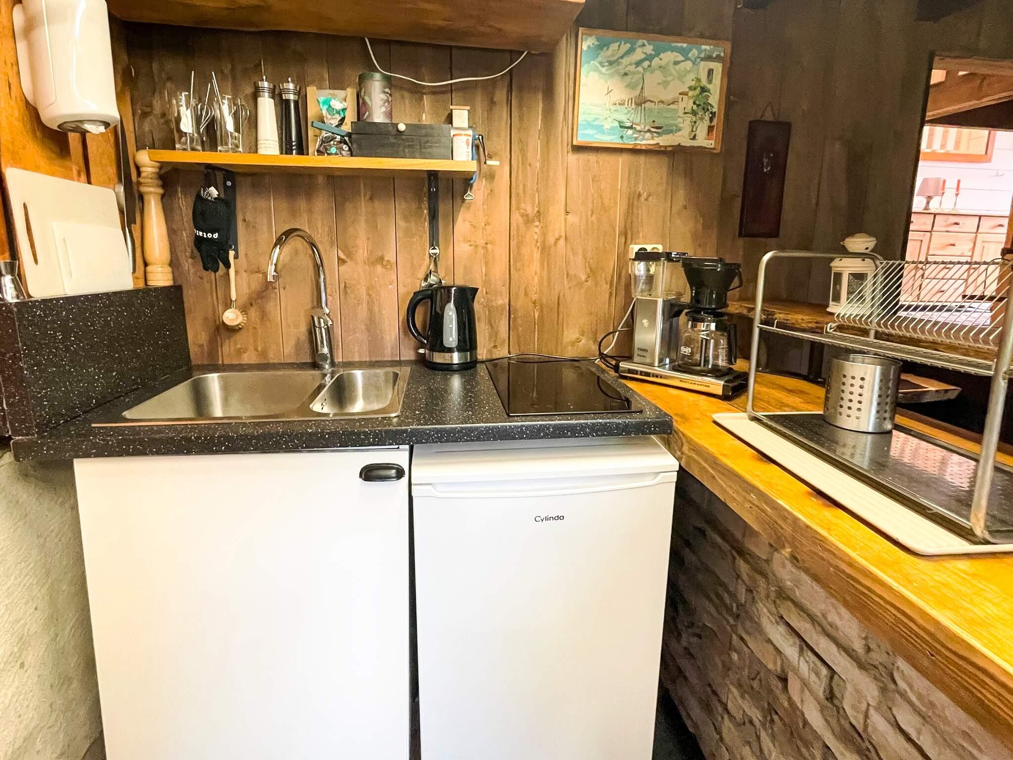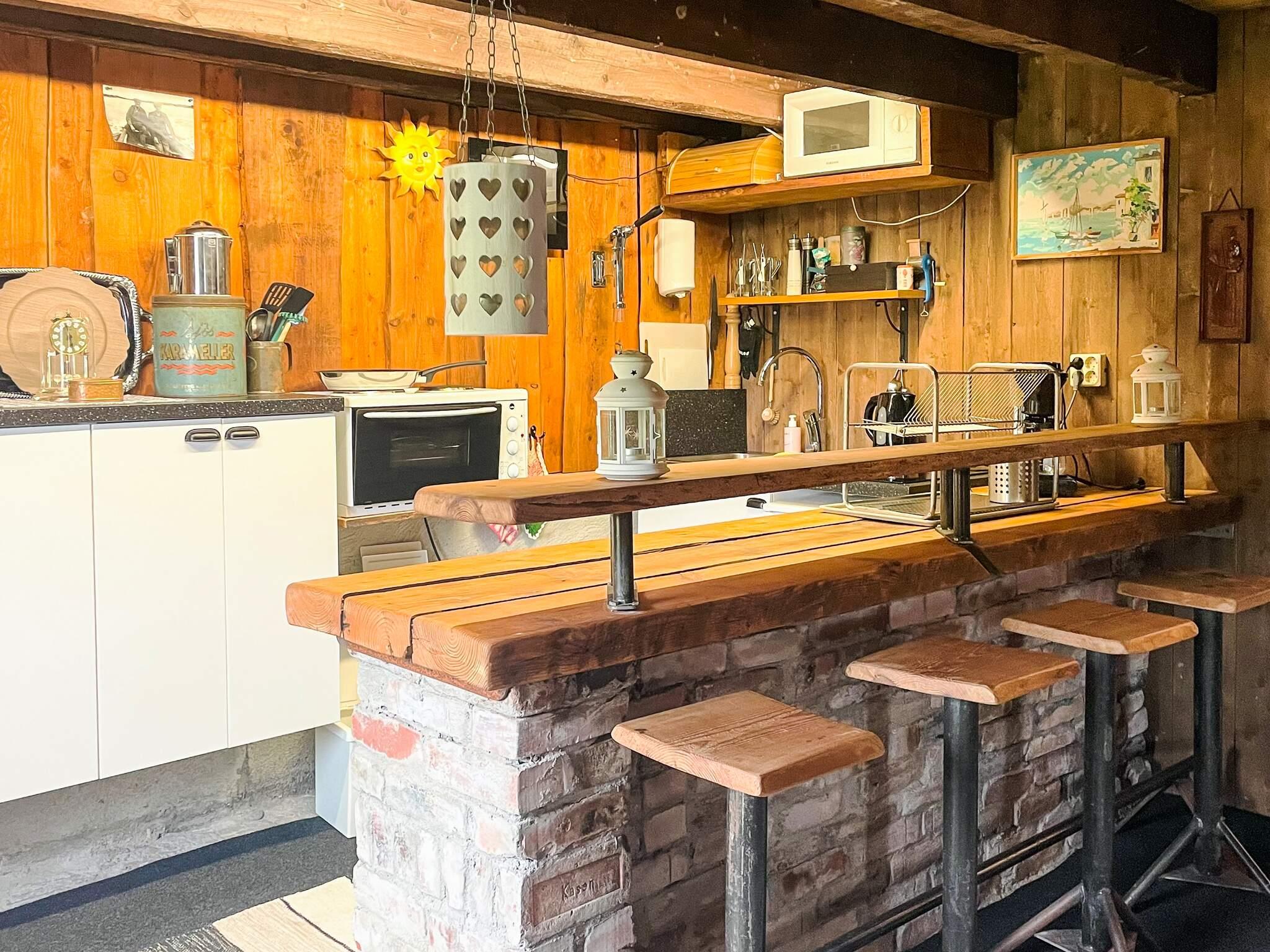 Køkken: Høj stol, elkogepl., komfur m/2 kogeplader og lille ovn, køleskab m/frostboks, mikroovn, kaffemaskine, vand fra brønd