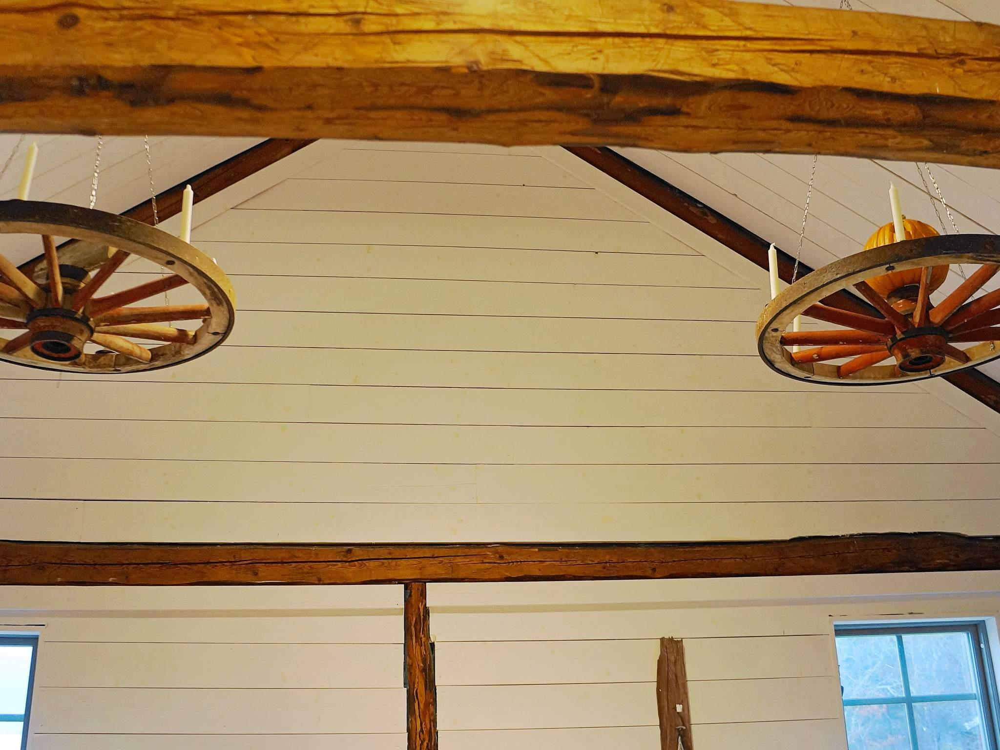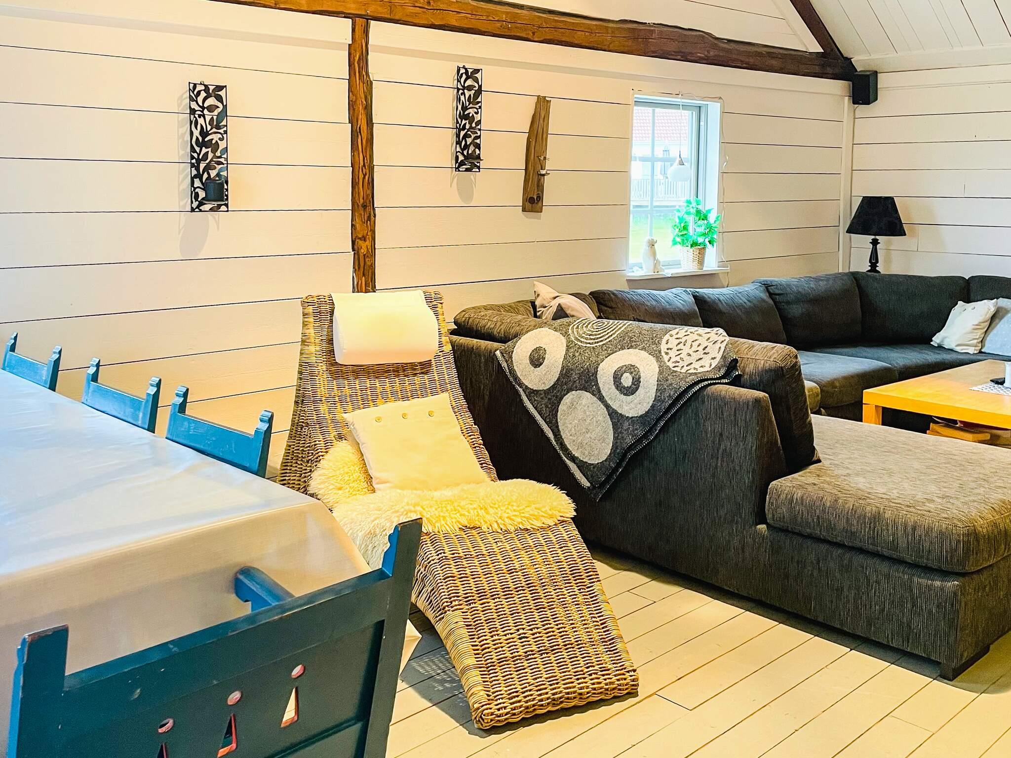 På övervåningen ligger det rymliga, ljusa vardagsrummet med högt i tak och synliga bjälkar. Här finns gott om plats för hela familjen i både soffhörnan och runt matbordet. I en mysig alkov avskärmad med draperi finns en bekväm dubbelsäng.