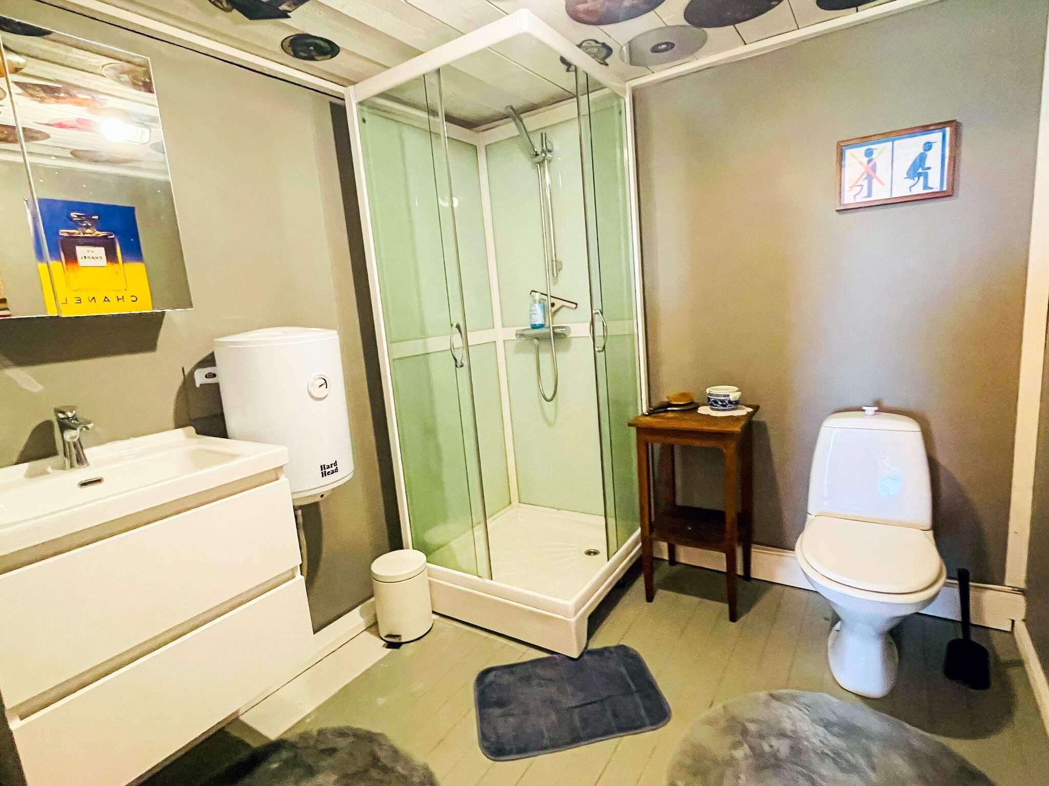 Vid entrén har ni en altan med härligt kvällssol där ni har utsikt över nejden och Kalvöfjorden. På entréplan ligger hall samt badrum med duschkabin där ägaren har dekorerat taket med sina gamla vinylskivor. En halvtrappa ned (lågt tak vid trappan) ligger barköket och sovrum i det som var det tidigare stallet. Här finns mycket av stallkänslan kvar med stallbås och obehandlat gjutet betonggolv i fin harmoni med de personliga inredningsdetaljerna. Barköket har en miniugn med två kokplattor. Ljust sovrum med öppen stallingång (ej dörr) och tre enkelsängar som fungerar som soffor med kuddar under dagtid. Ett perfekt sovrum/allrum för barn och ungdomar som vill bo lite för sig själva.