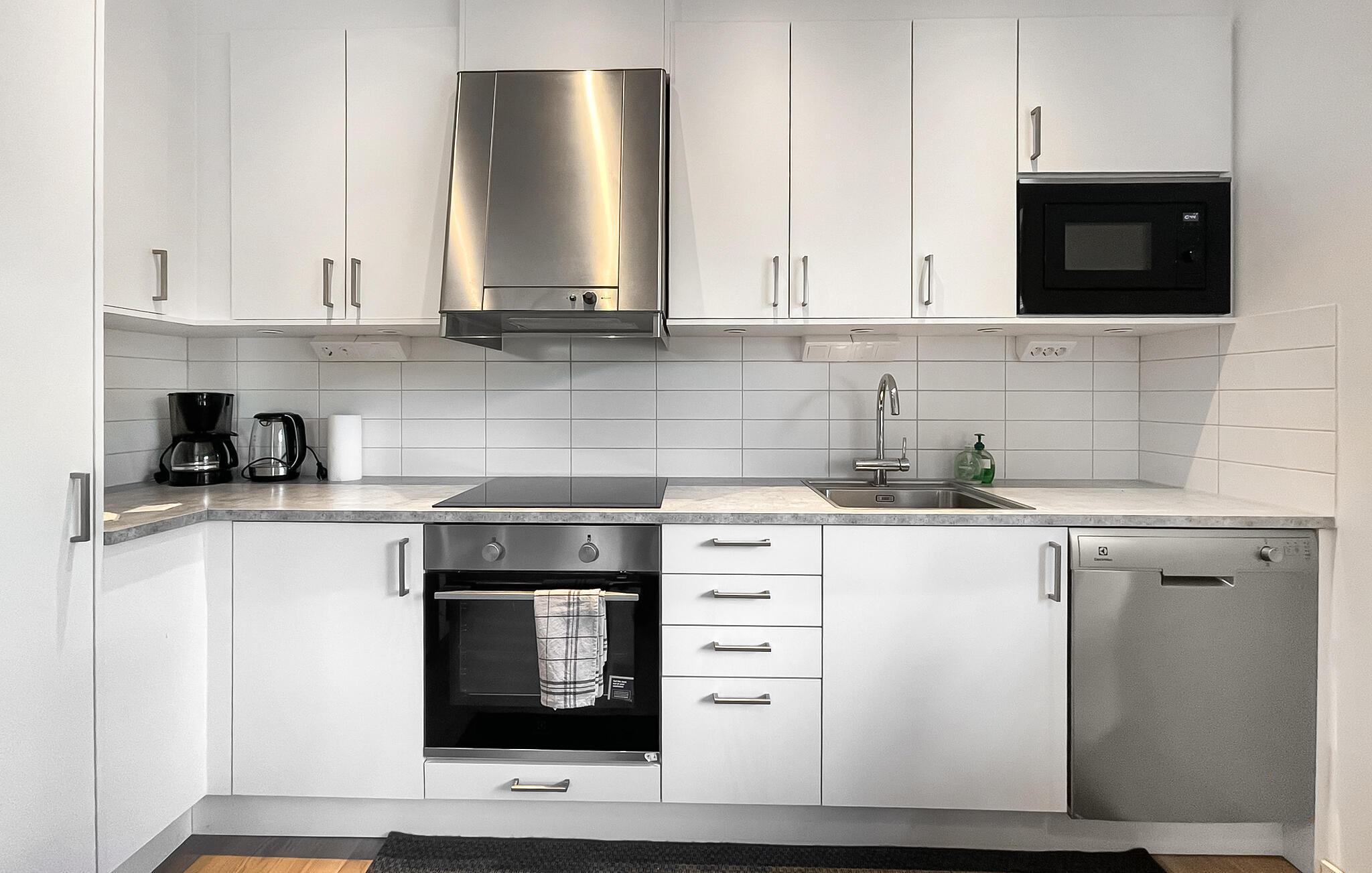 Nyd den komfortable sofakrog i jeres feriehus, hvor I kan afslutte dagen med en film på tv'et og tilbringe tid sammen med familien. Tilbered jeres måltider i det moderne køkken med adskillige apparater, og sæt jer ved det tilstødende spisebord til fælles måltider i en afslappet atmosfære.