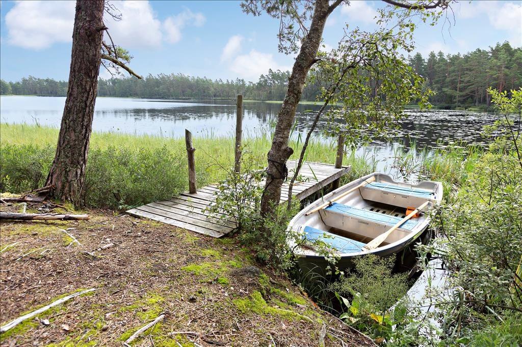 Dette hus er velegnet til alle, der gerne vil have skov og sø lige uden for døren. Det ligger på en eng midt i skoven og tæt på en bakke med fantastisk udsigt. Til huset hører 28 hektar skov, fyldt med blåbær og kantareller. Huset ligger i Hetseryd, syd for Vrigstad, for enden af en privat blind vej og ca. 1 km fra nærmeste nabo. Området er meget kuperet med mange søer. Gennem skoven når man på ca. 5 minutter den lille sø Kåragårdsgölen, der grænser op til grunden, og hvor husets egen robåd ligger. På 5 minutter når man også den store sø Norrsjön, hvor der også er en badested ca. 10 minutter fra huset. Astrid Lindgrens Värld, Kleva Gruva og High Chaparral kan nemt nås i bil. Indkøbsmuligheder, apotek og hæveautomat findes i Vrigstad, 7 km fra huset. Der er et posthus 5 km væk i Stockaryd, hvor det også er muligt at handle. I Sävsjö, 20 minutter i bil, er der flere store supermarkeder.