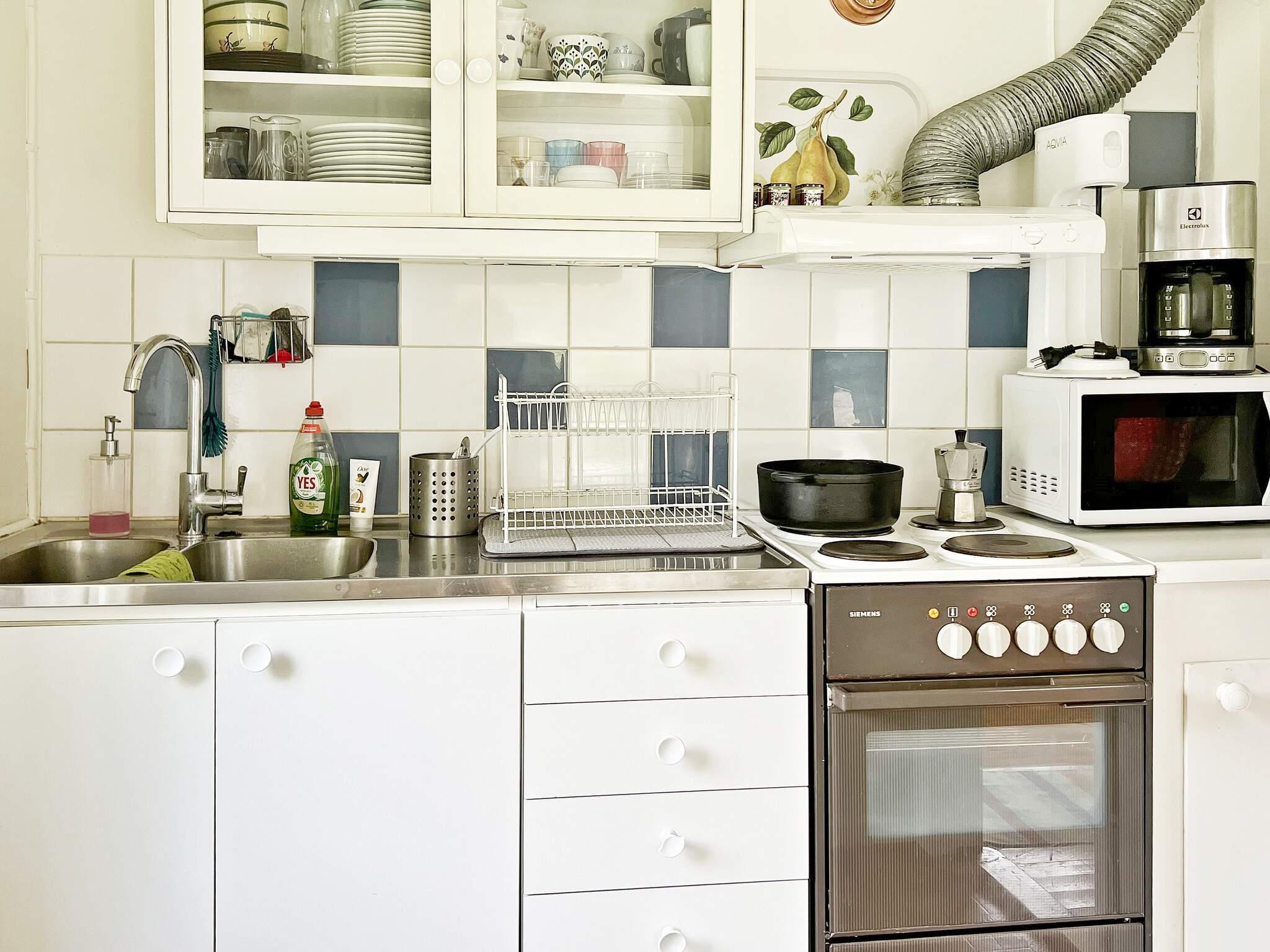 Køkken: El-komfur, køleskab m/frostboks, mikroovn, emhætte, kaffemaskine, vand fra brønd