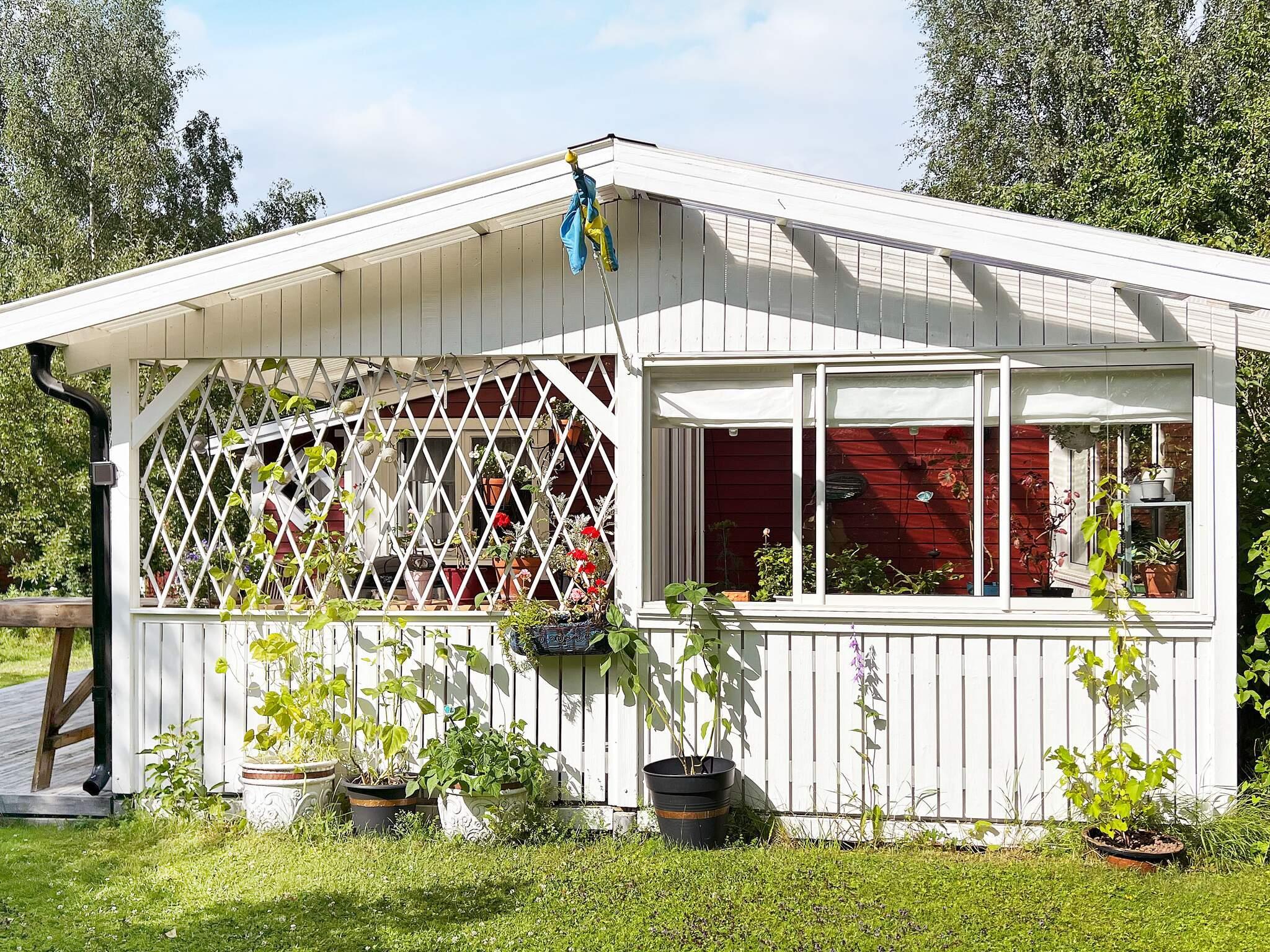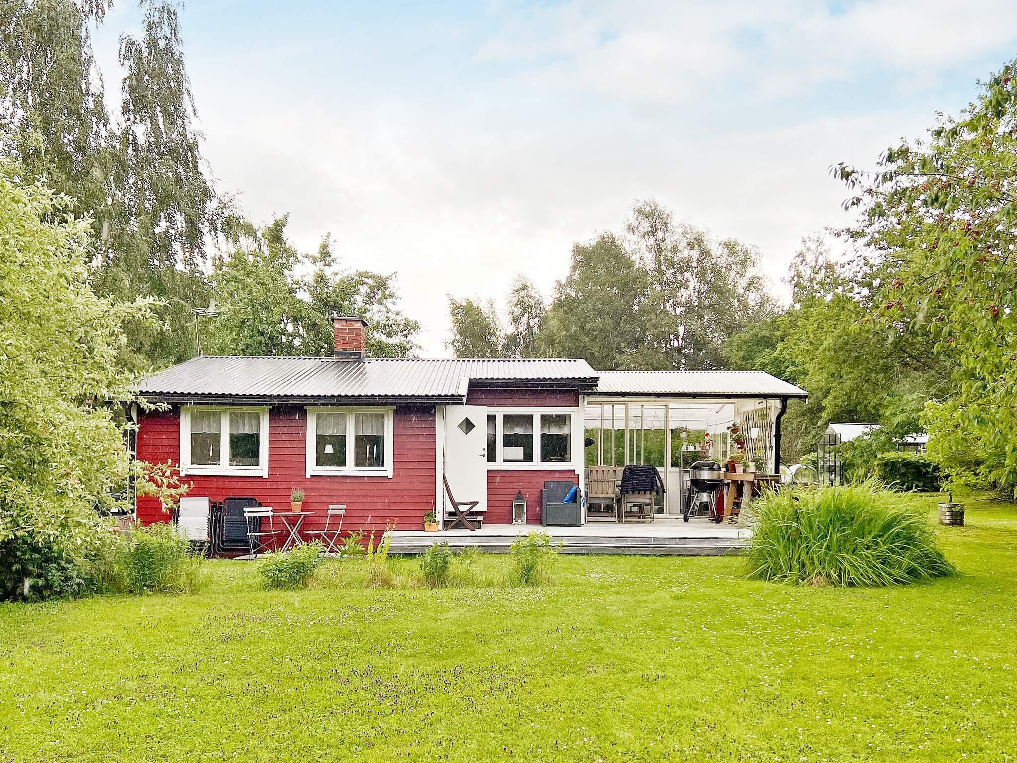 Tomten består av en stor och plan gräsmatta, perfekt för lekar och spel. Tomten har många fruktträd och bärbuskar, bara att plocka och äta. Huset har en härlig altan, en del är öppen, en med tak, och ett inglasat uterum där det är mysigt att sitta under kyliga kvällar. Huset är ett charmigt och välinrett sommarhus, med ett rymligt vardagsrum med en dagbädd som blir en dubbelsäng, ett sovrum med en enkelsäng, ett litet kök och matplats. I köket finns det bland annat vattenkokare, mikro och kaffekokare.