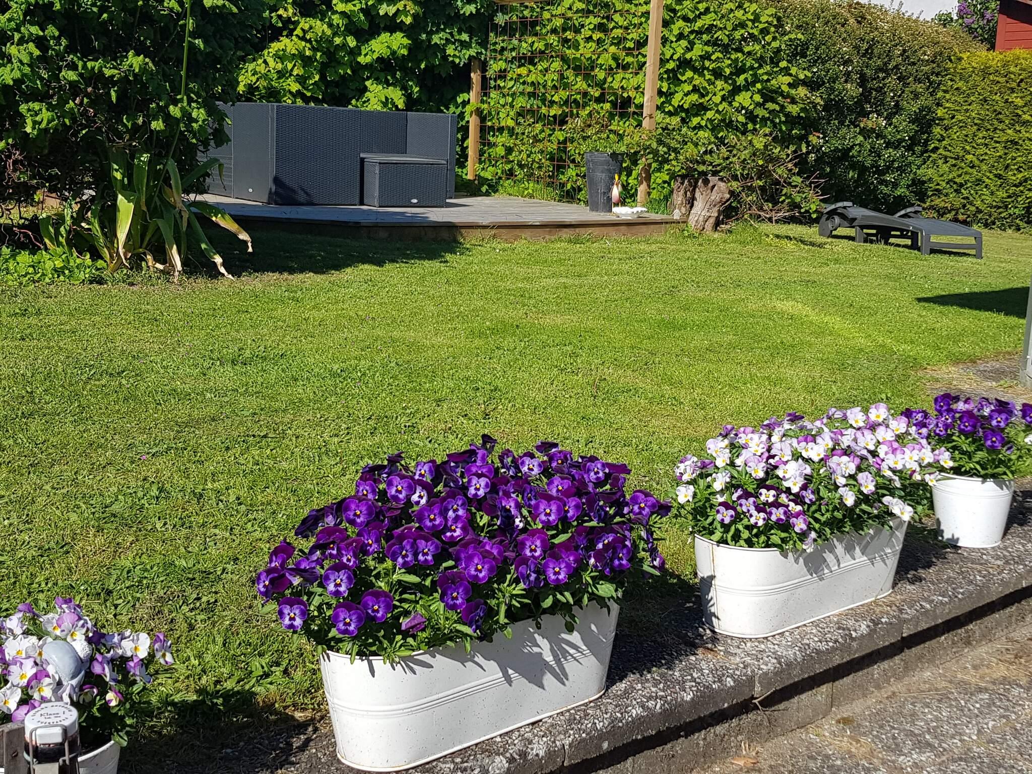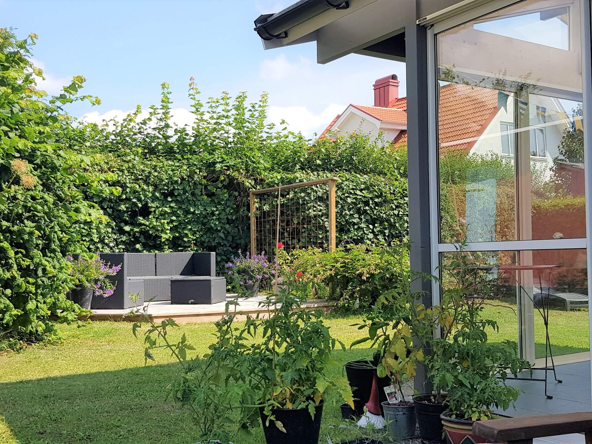 Huset ligger i ett villaområde med en härlig trädgård med gräsmatta. På baksidan finns två altaner med utemöbler och grill. Här kan man välja om man vill följa solen eller sitta i skuggan. Baksidan är i ett skyddat läge och även om huset ligger centralt är baksidan i princip insynsskyddad. Det finns diverse utomhusspel att välja mellan.