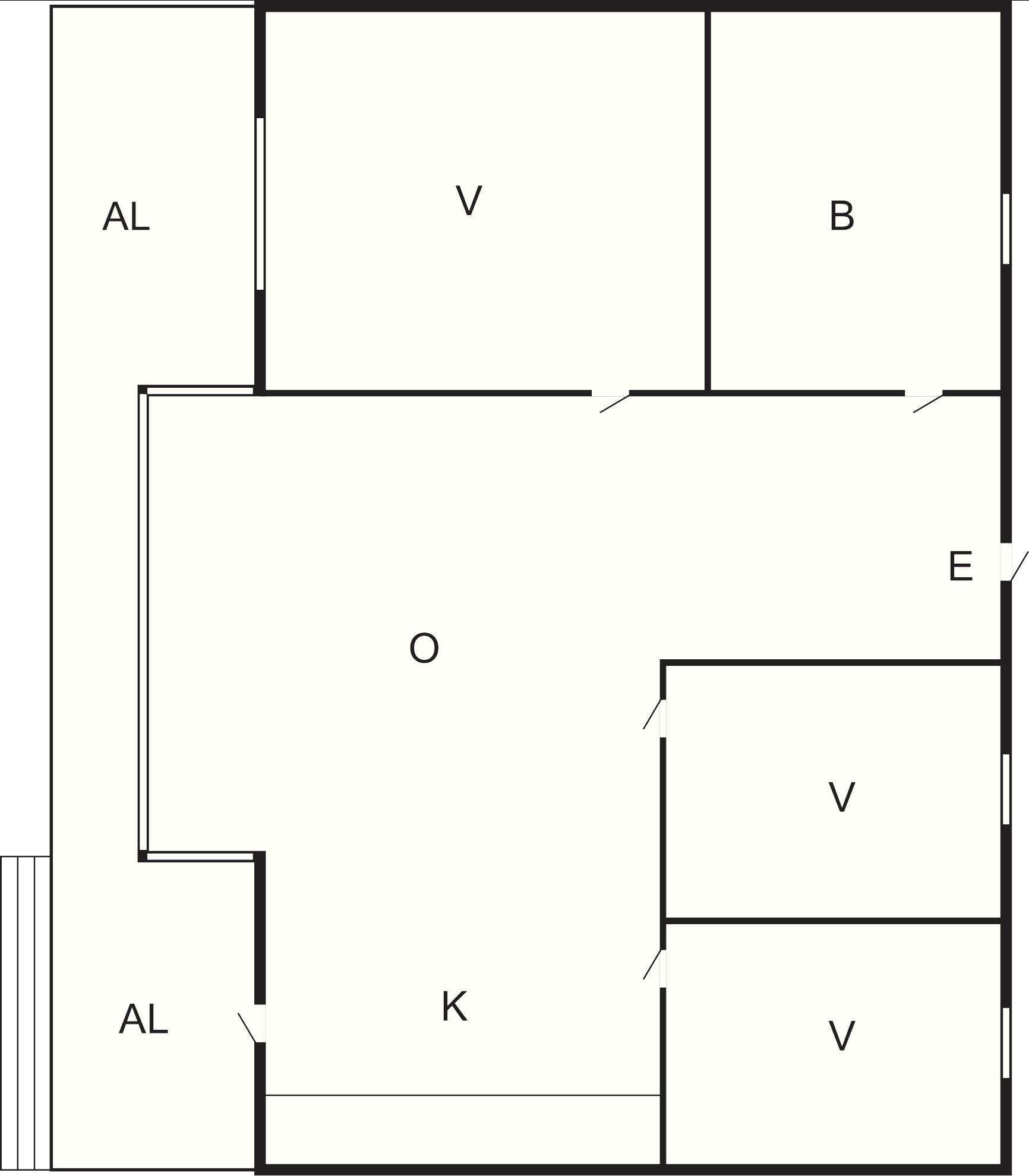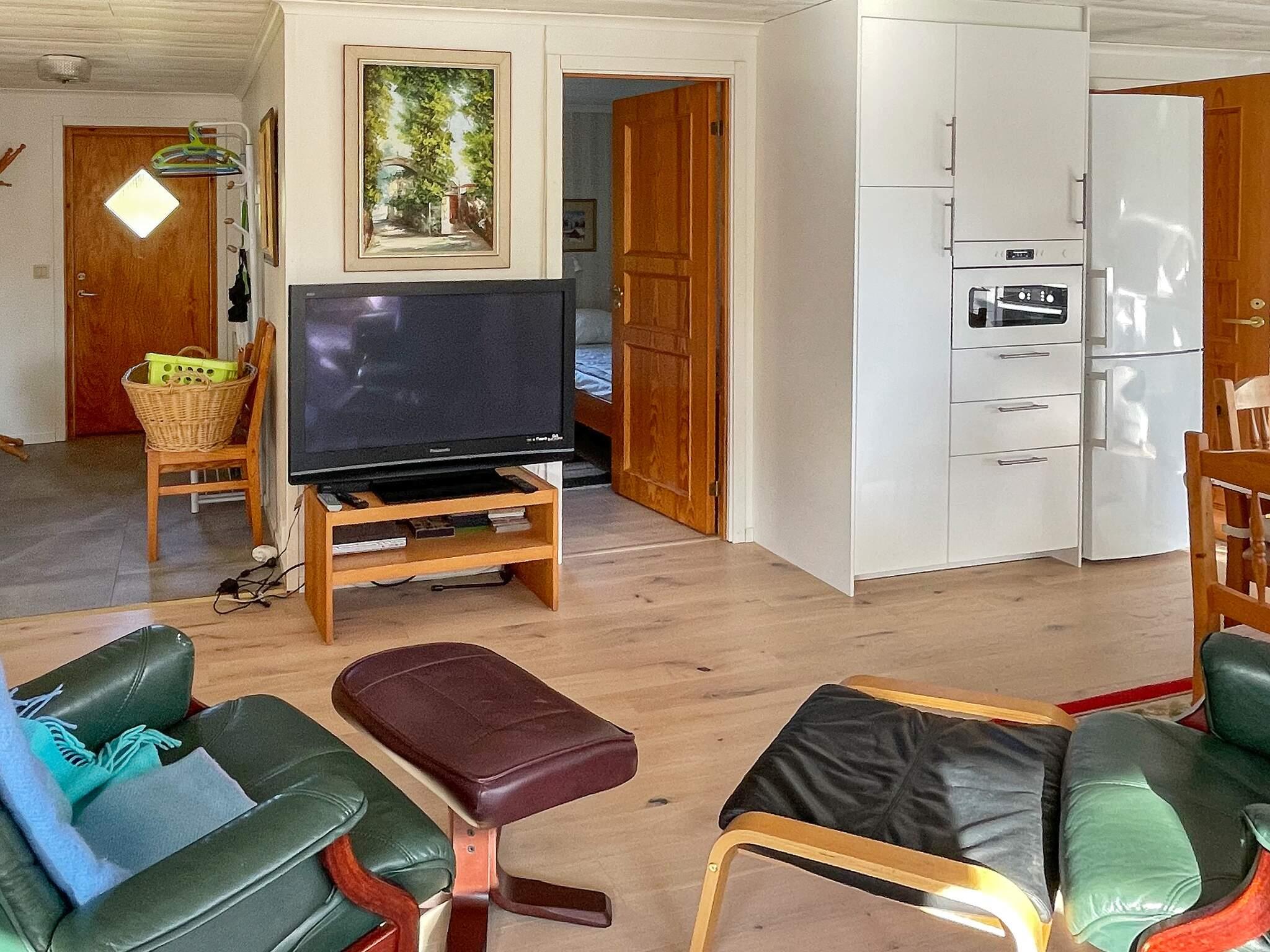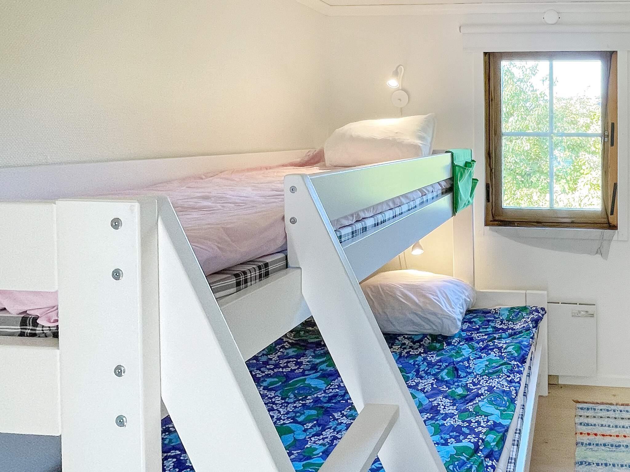 Huset har ett stort altangolv som rymmer solstolar, bar bord med pallar att sitta på och trädgårdsmöbler. Här finns plats att både koppla av och avnjuta maten från grillen. Altandörr direkt in i köket som har alla bekvämligheter och matbord att samlas kring inomhus. I den öppna planlösningen finns även vardagsrum med tv. Två soffor varav den ena är bäddsoffa och kan fungera som extrabädd. Dubbelsäng, två enkelsängar och våningssäng med extra bred underslaf är fördelat på de övriga tre sovrummen i huset. Detta mycket välplanerade hus har även ett stort och rymligt badrum intill hall och entrédörren på baksidan av huset, från infarten på tomten sett.