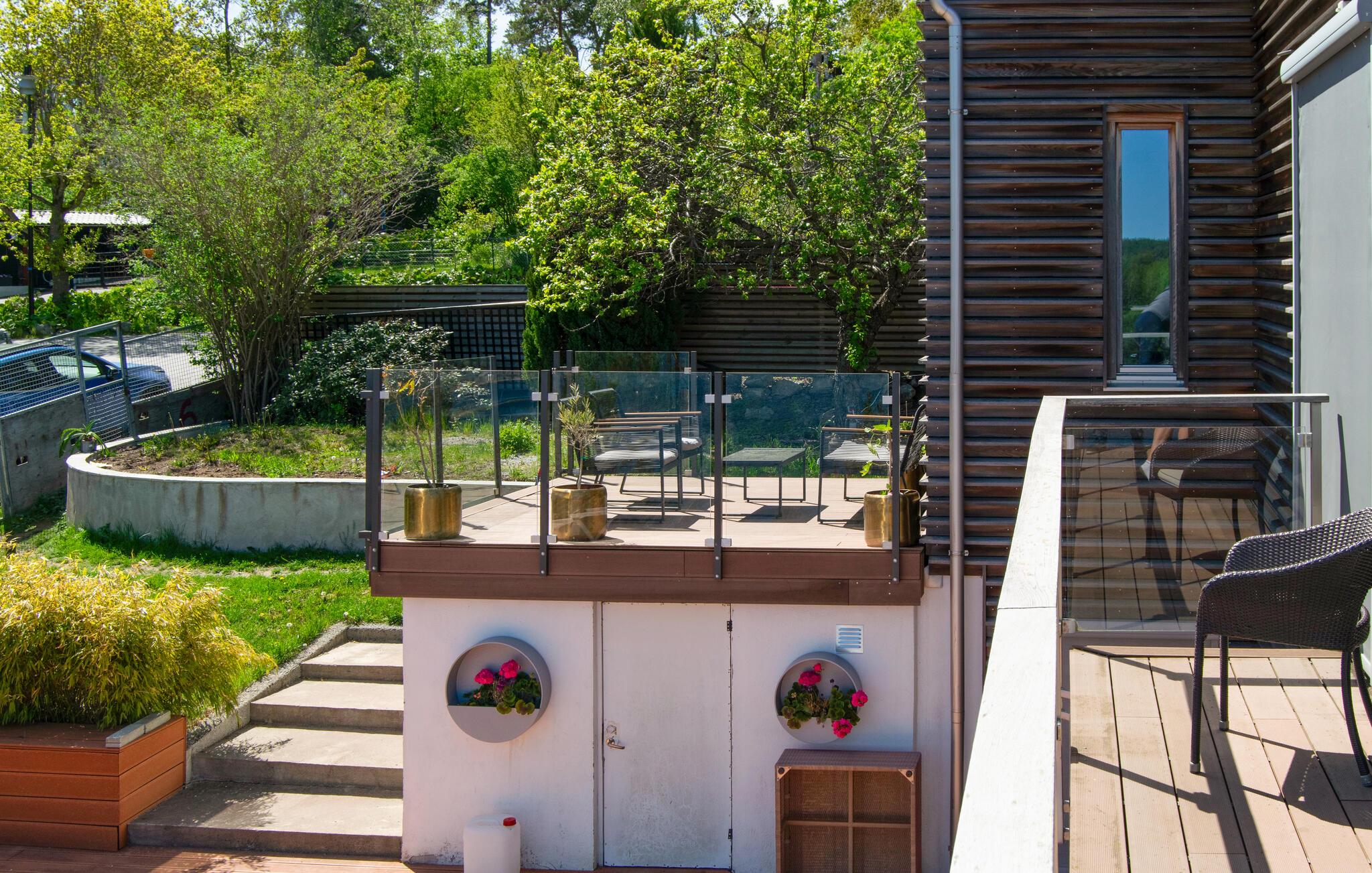 Gå ud på den store terrasse, og sæt jer ved det rummelige havebord. Tag en forfriskende dukkert i den private pool, eller slap af i spabadet, og find ro i saunaen med direkte udgang til det fri. Se bådene glide forbi, og nyd stilheden under en grillaften. Husets placering på skråningen sikrer både maksimal udsigt og privatliv.