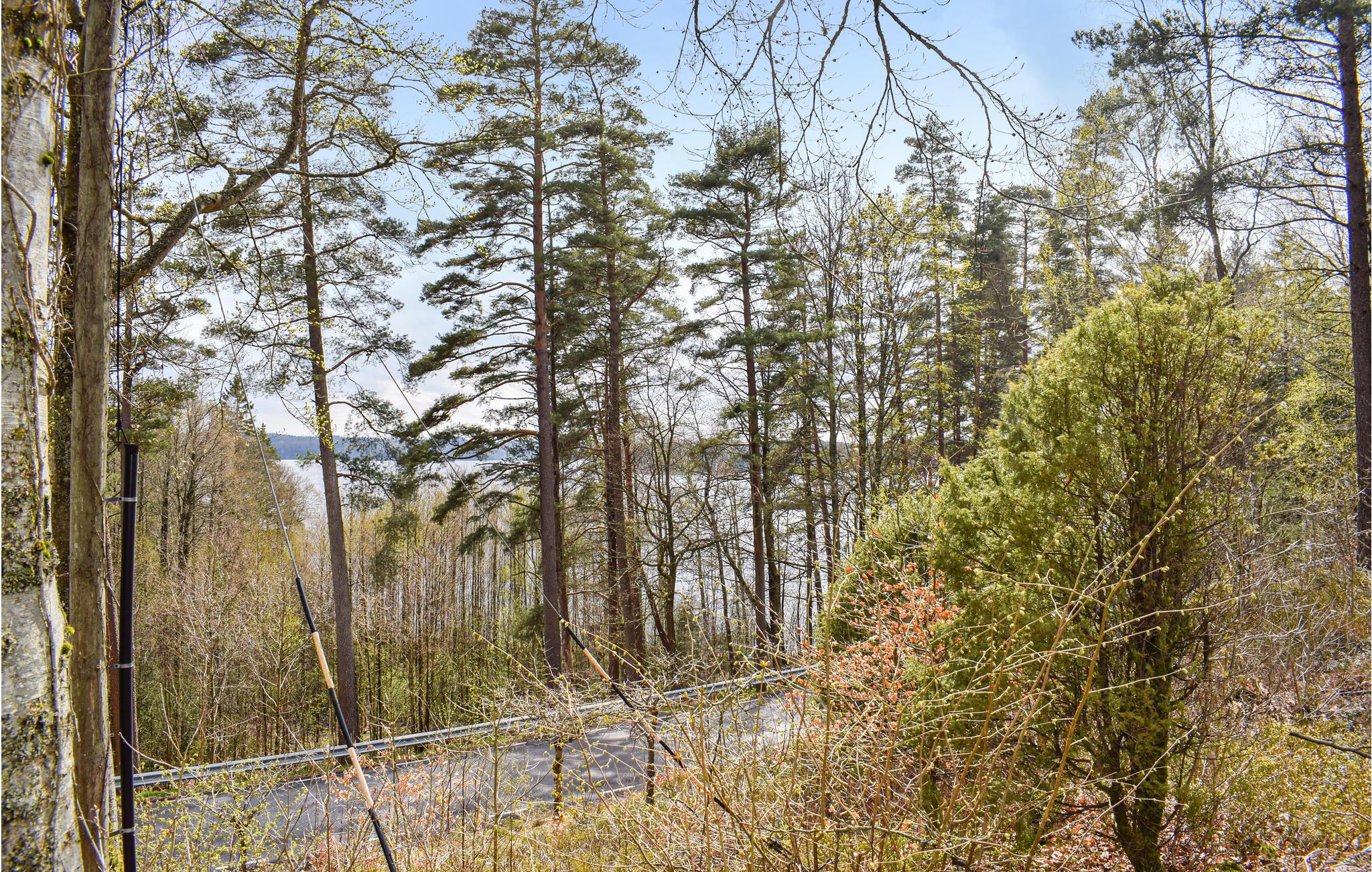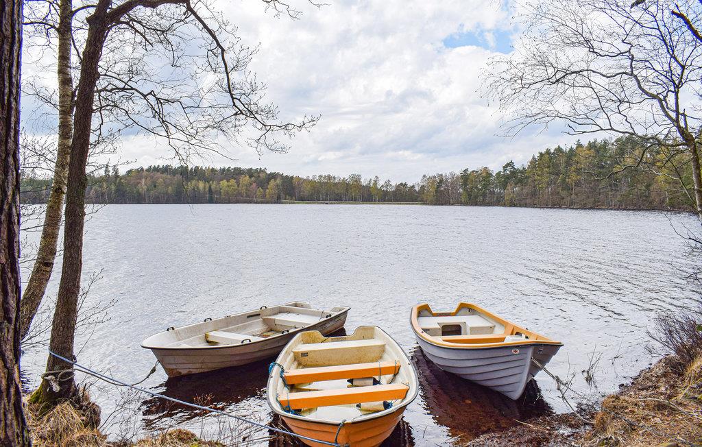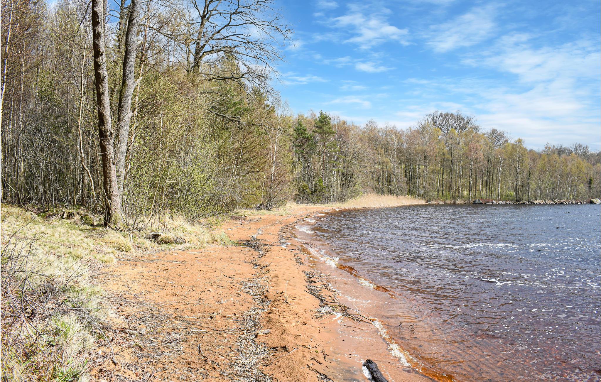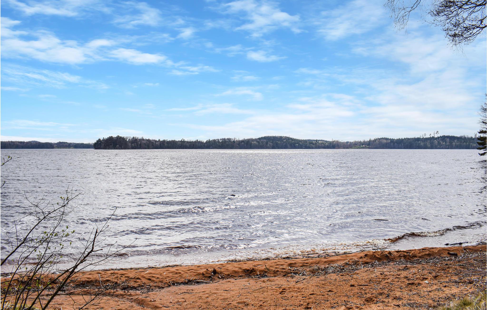 Bad i søen kun 100 m væk,. Båden ligger i en lille bugt ikke langt fra sommerhuset.
