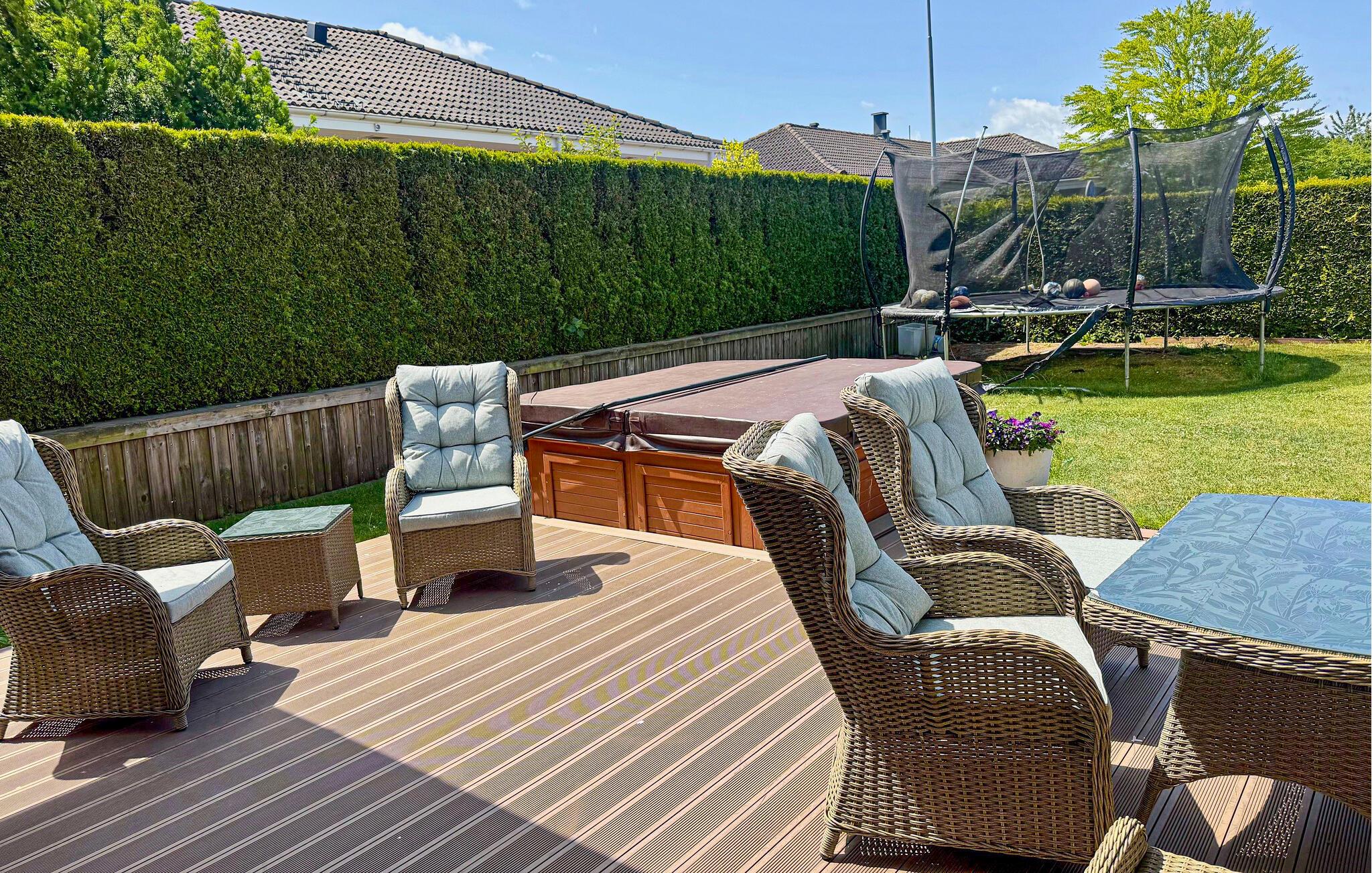 Den velholdte, overdækkede have er børnevenlig og lokker yngre gæster til at nyde den friske luft med en dejlig trampolin. I mellemtiden kan I snakke over friskbrygget kaffe på terrassen eller dække bordet til grillmiddagen.