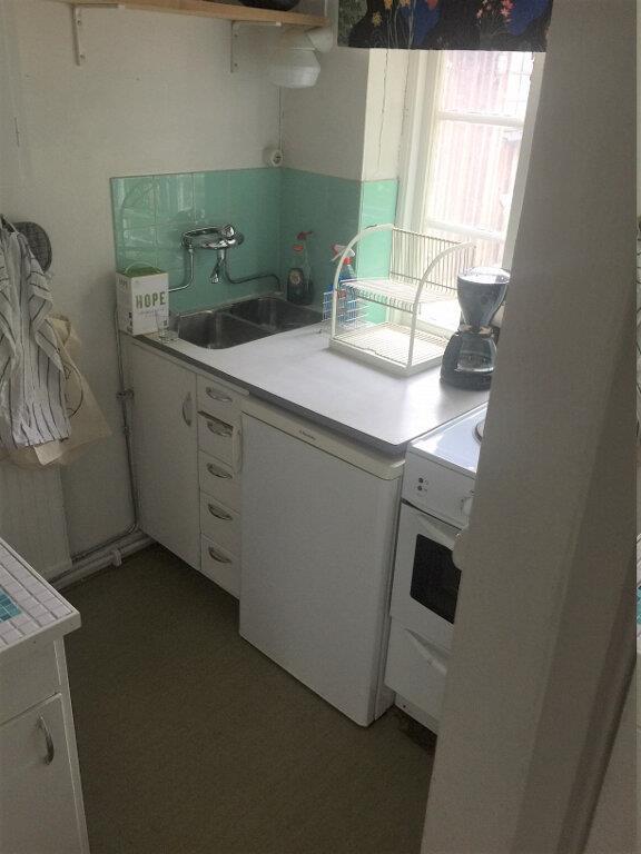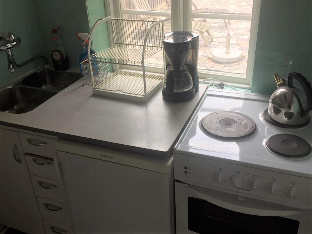 I stueetagen er der et godt lille tekøkken med bl.a. 3 kogeplader samt ovn og køleskab. Tekøkkenet ligger i åben forbindelse med spisestuen og entreen, hvor mikroovnen og fryseren er placerede. Der er separat toilet i forbindelse med entréen. Badeværelset, der ligger i en tilstødende bygning, væg til væg med feriehuset, har brusebad, vaskemaskine og tørretumbler.