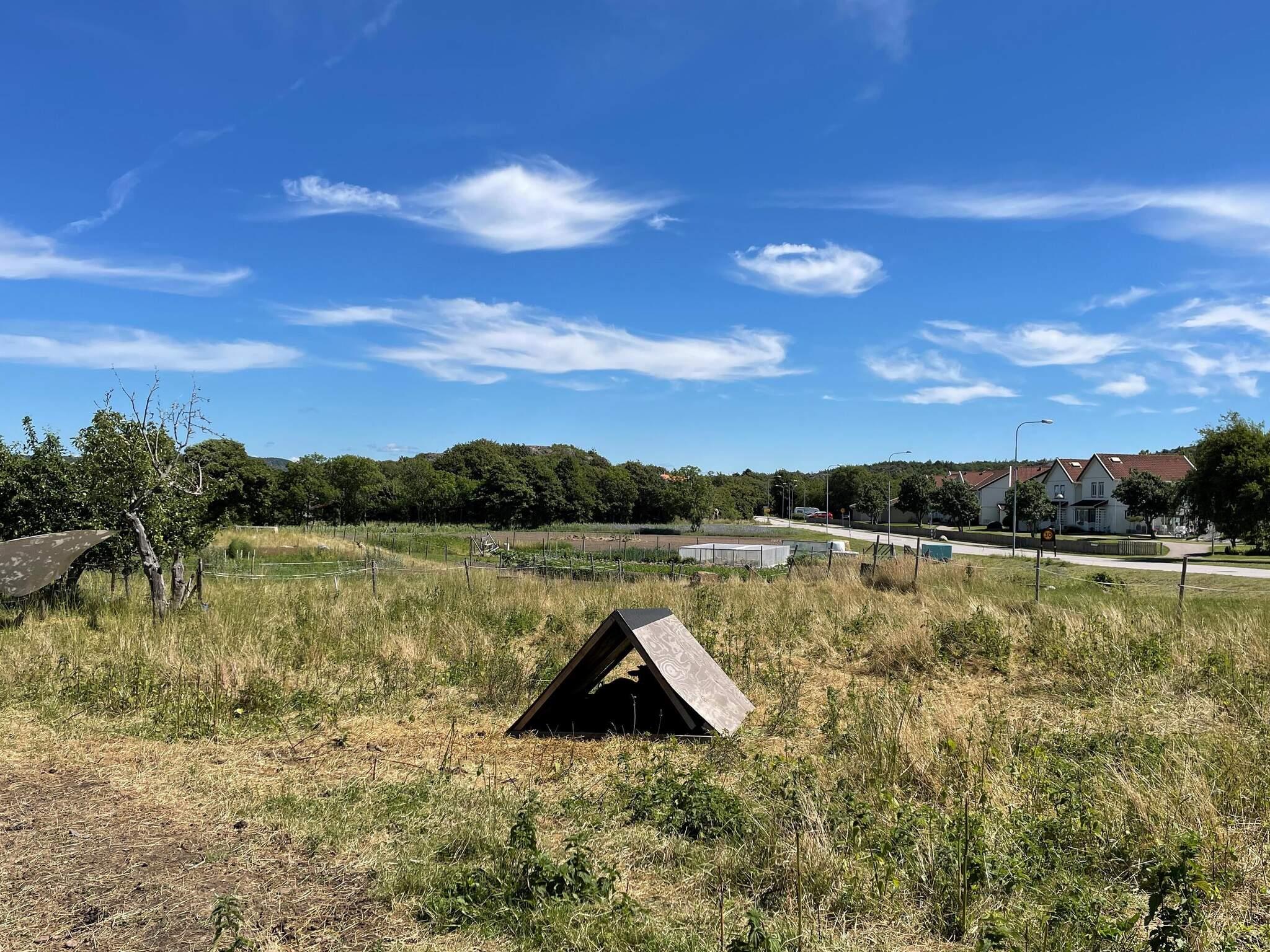 Utanför finns en gräsmatta för lek samt utemöbler och grill. Stugan ligger en bit ifrån ägarens hus så man störs inte alls av varandra. Vissa tider på året bor fåren i hagen intill annars är de ute på sommarbete. Stugan ligger intill en lokalkörbana med mindre trafik.