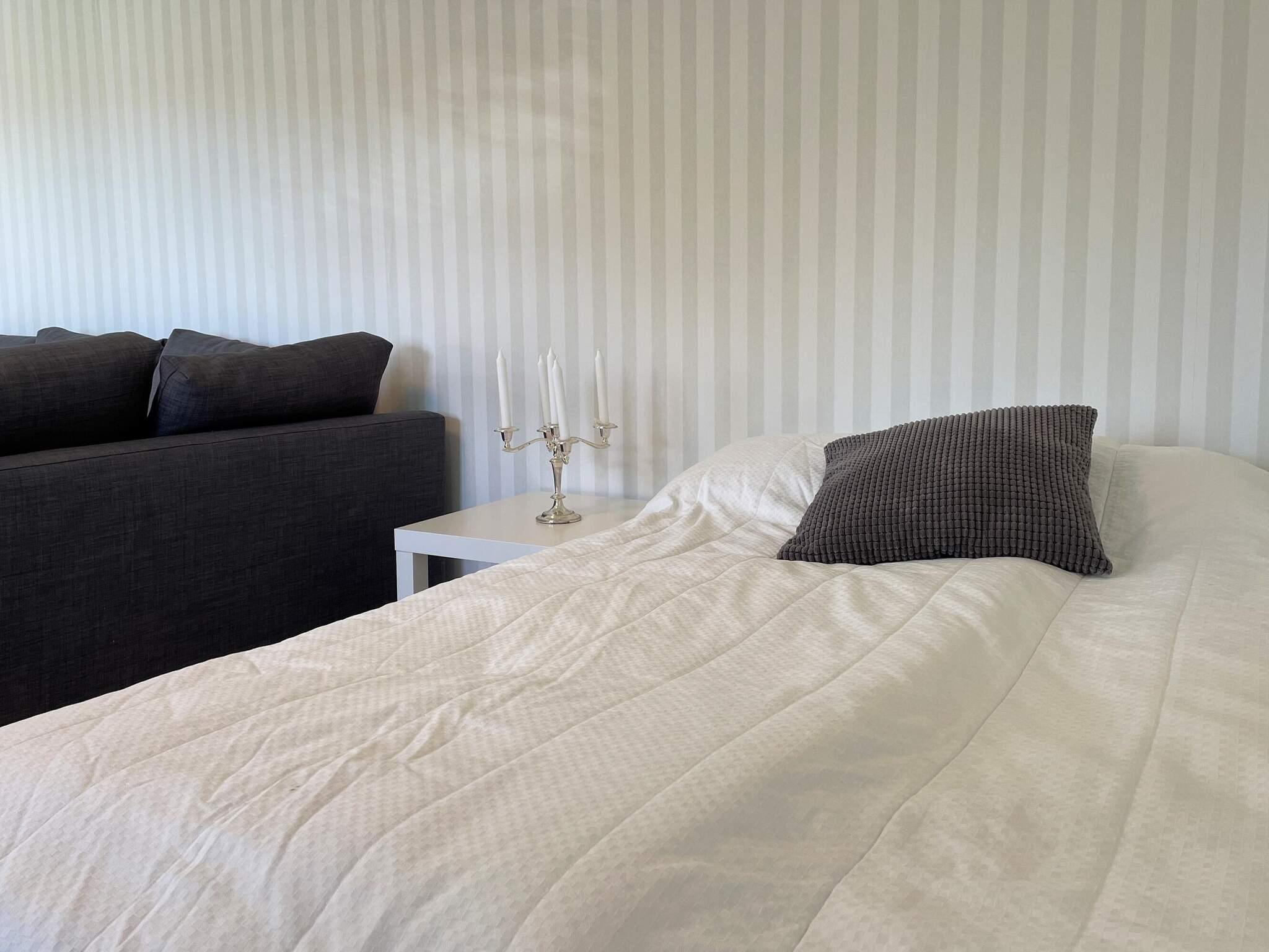 Stugan är ljus och fin och har en sovalkov i vardagsrummet med en enkelsäng som är 120cm. Det finns en divansoffa som till kvällen enkelt bäddas ut till dubbelsäng 140cm samt en extrasäng 80cm att placera intill. Rymligt matbord med plats för 6 personer samt en barnstol till den yngsta resenären. Här kan alla sitta och njuta av måltider där dörren står öppen och utanför kunna ta del av den härliga sommarkänslan.