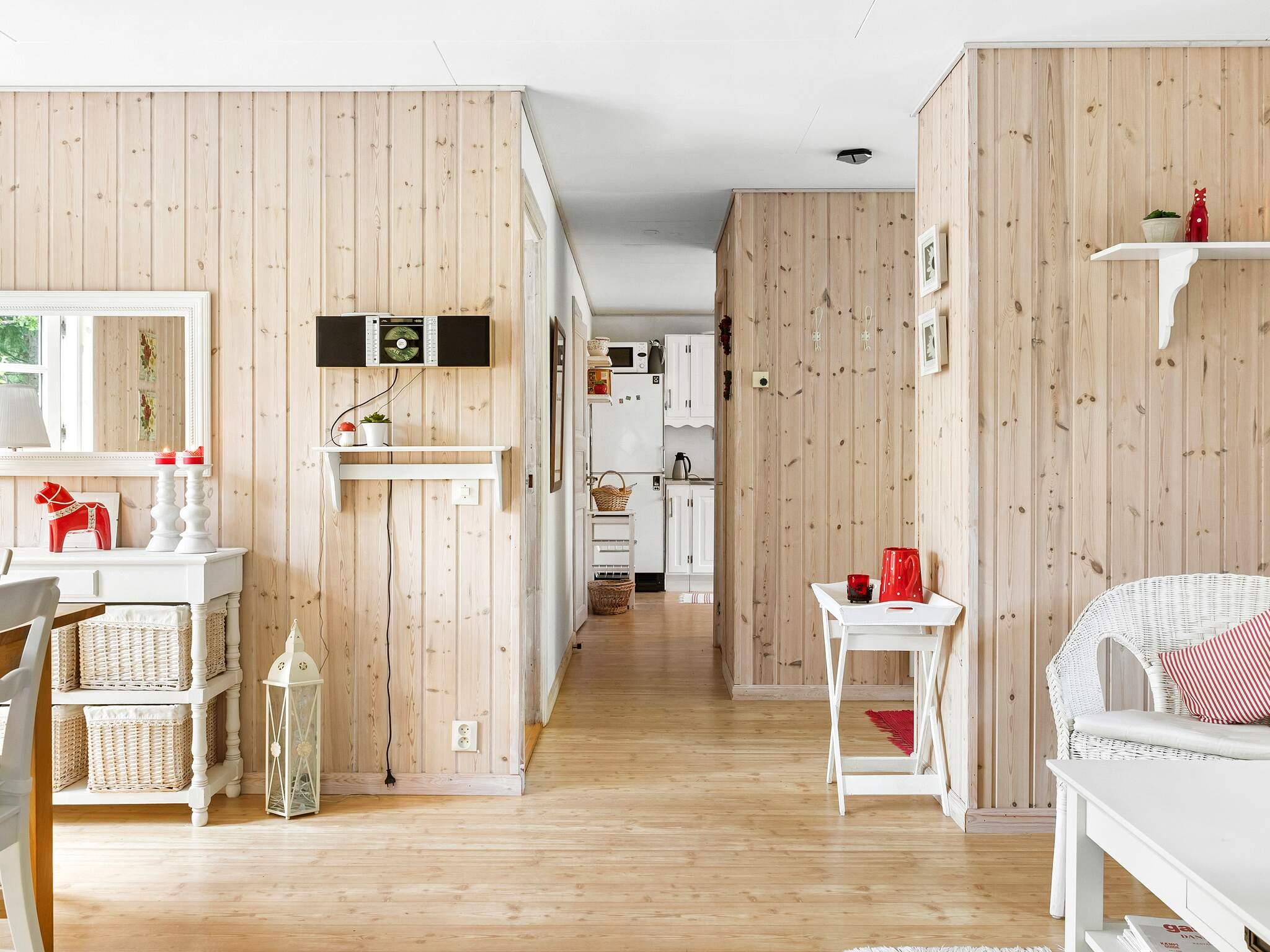 Vardagsrummet ryms med två större soffor varav den ena är en dubbelbädd. Även fåtölj och fler sittmöjligheter finns. Kvällens måltid äter du gärna härinne, samtidigt som du kan öppna upp altandörren ut till det stora träddäcket. Soffgruppen känns dessutom otroligt inbjudande till kakor och kaffe, helt enkelt en mysig fika framför den tända brasan.