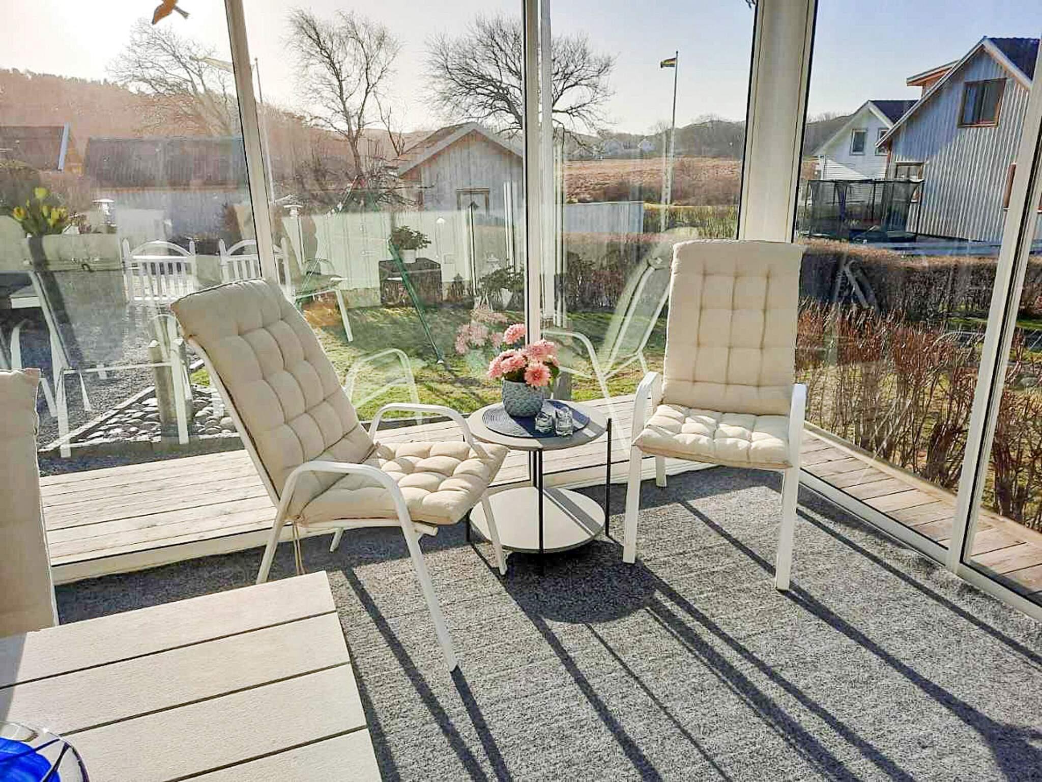 Stugan består av luftigt och fint vardagsrum med trevlig möblering, bäddsoffa, Tv samt en värmande braskamin, denna känns extra mysig med sin lite lägre takhöjd på ca 1,95. Bekvämt kök utrustat med spis, mikro, kyl/frys, kaffebryggare och diskmaskin. I köket finns även köksbord och stolar samt tillgång till barnstol. Härlig dubbelsäng finns i sovrummet bredvid. Rejält badrum med golvvärme, dusch, wc och tvättmaskin. Från hallen leder en trappa upp till ett sovloft, takhöjden på loftet är 1,65 och är en mycket uppskattad sov och umgängesyta för barn, upplevs som både spännande och kojliknande. Vid entrén ligger en stort härligt inglasat uterum med utemöbel och grill, en självklar plats att umgås på efter de sköna och uppfriskande baden i havet eller efter utflykt i Bohuslän. Kanske njuter ni av havets läckerheter såsom pinfärsk makrill, saftiga goda kräftor, räkor eller en välfylld krabba med något gott drickbart därtill.