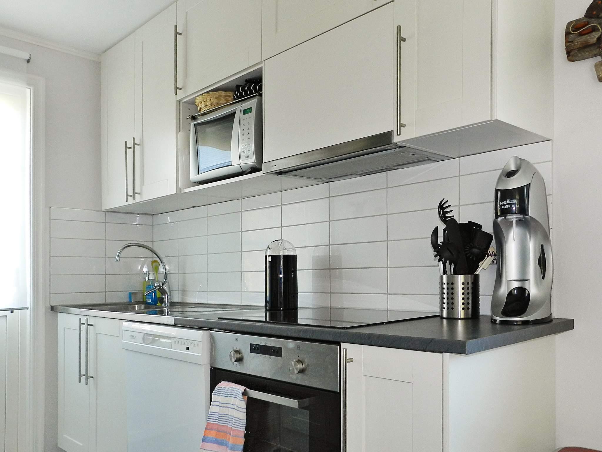 Køkken: Høj stol, el-komfur, køle-frys, mikroovn, emhætte, kaffemaskine, opvaskemask.