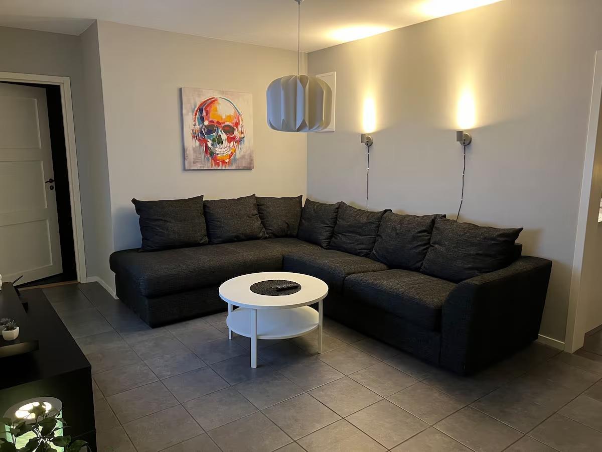 Stor TV-stue med hjørnesofa.