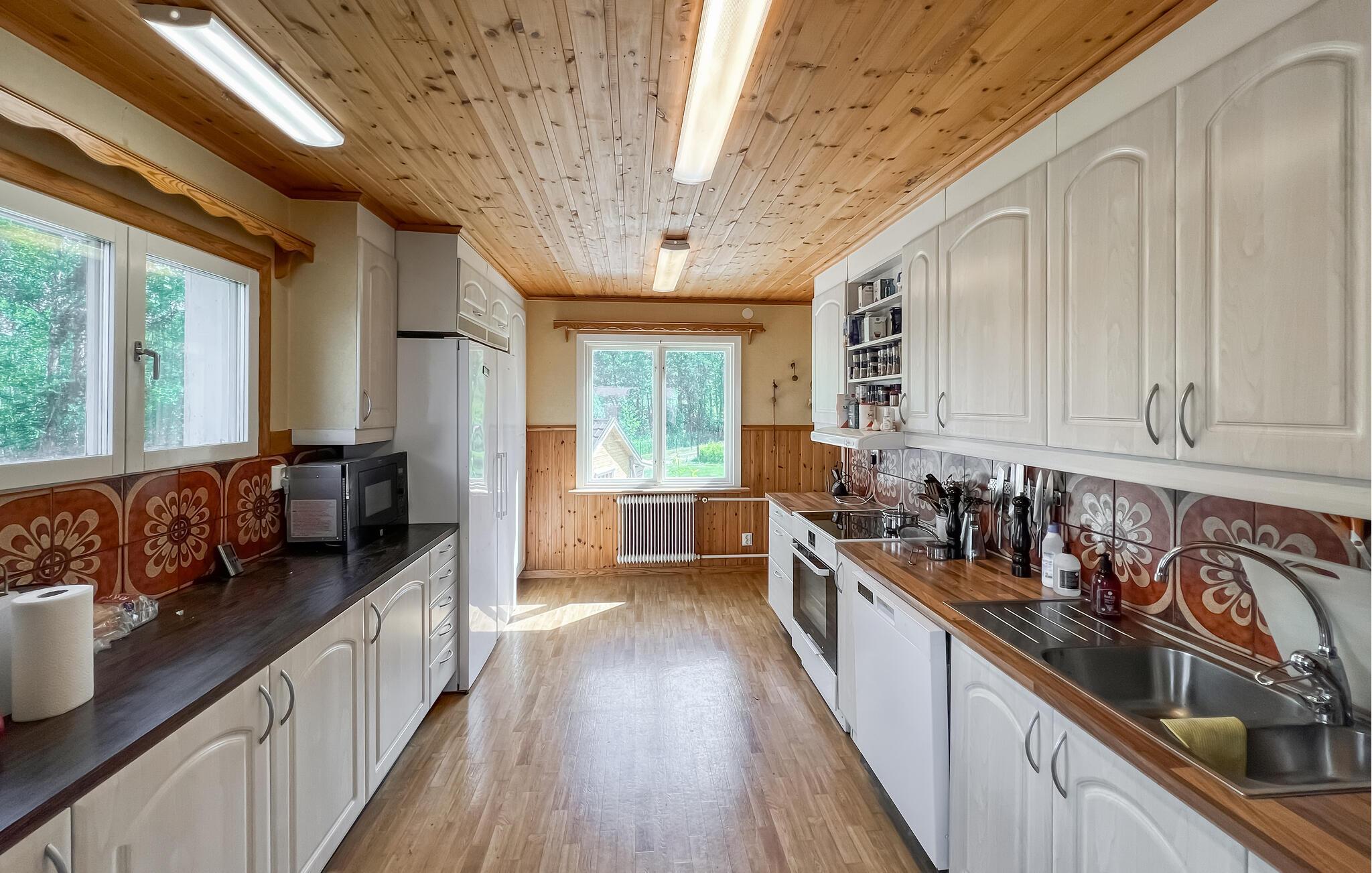 Idyllisk ved Hästnäsviken-bugten ligger dette feriehus med en unik panoramaudsigt over det omkringliggende skærgård. Nyd freden og nærheden til naturen, mens I drikker morgenkaffen på den rummelige terrasse og indånder den friske havluft. Begynd dagene i det veludstyrede køkken og tilbered en overdådig morgenmad for hele familien. Server jeres måltider i den hyggelige spiseplads med udsigt over havet og planlæg jeres dag her. Med den medfølgende kikkert kan I se bådene eller fuglene sejle forbi.