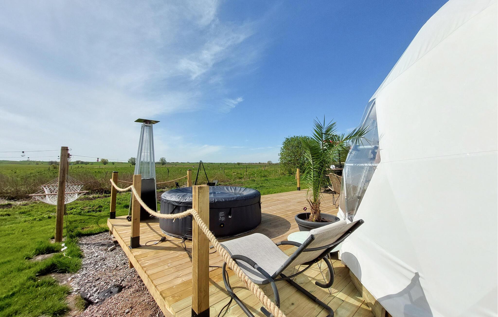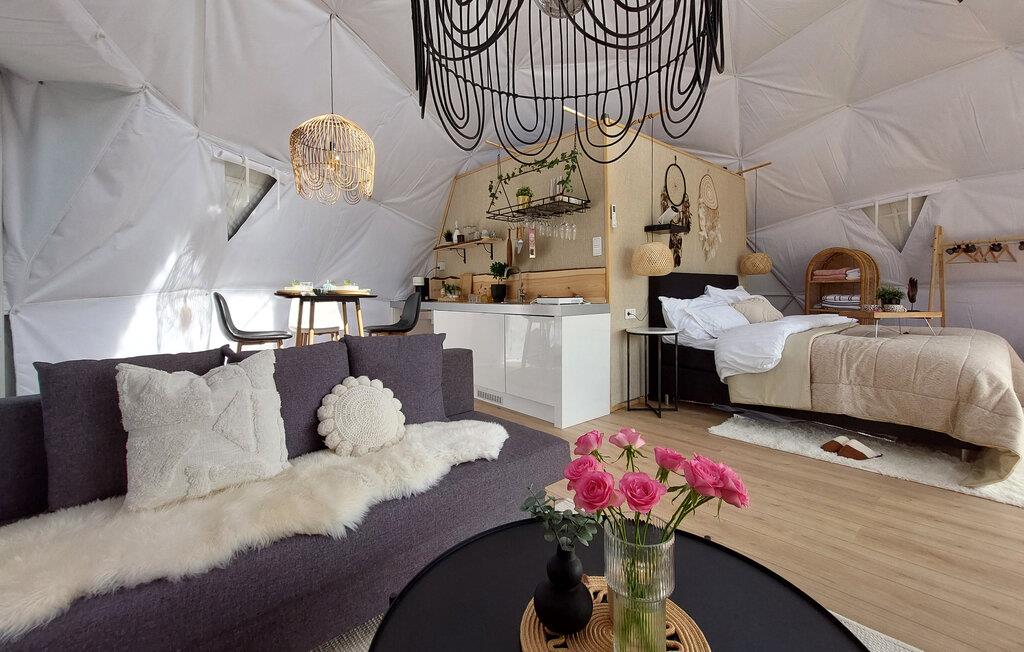 Hvis I er på udkig efter en ferieoplevelse ud over det sædvanlige, og vil I gerne opleve naturen fra allernærmeste hold, er I kommet til det helt rette sted. Denne bolig er en såkaldt Glamping Dome, der på utrolig vellykket vis forener komfort og camping og skaber en helhedsoplevelse, I sent vil glemme. Indvendigt emmer det af hygge med finurlige udsmkningsdetaljer og en vidunderlig udsigt, som kan nydes fra de behagelige hængestole med en god bog eller en kop kaffe fra morgenstunden.