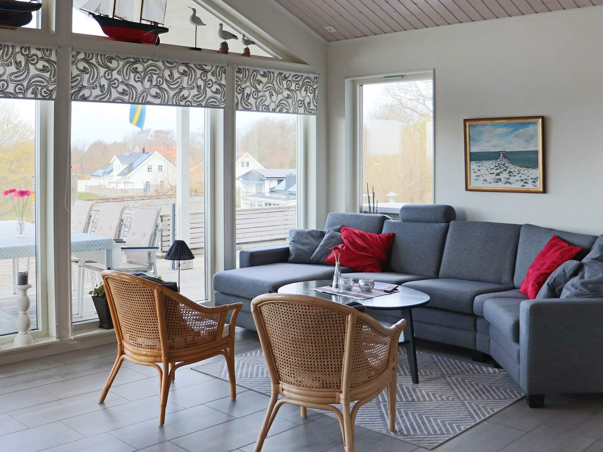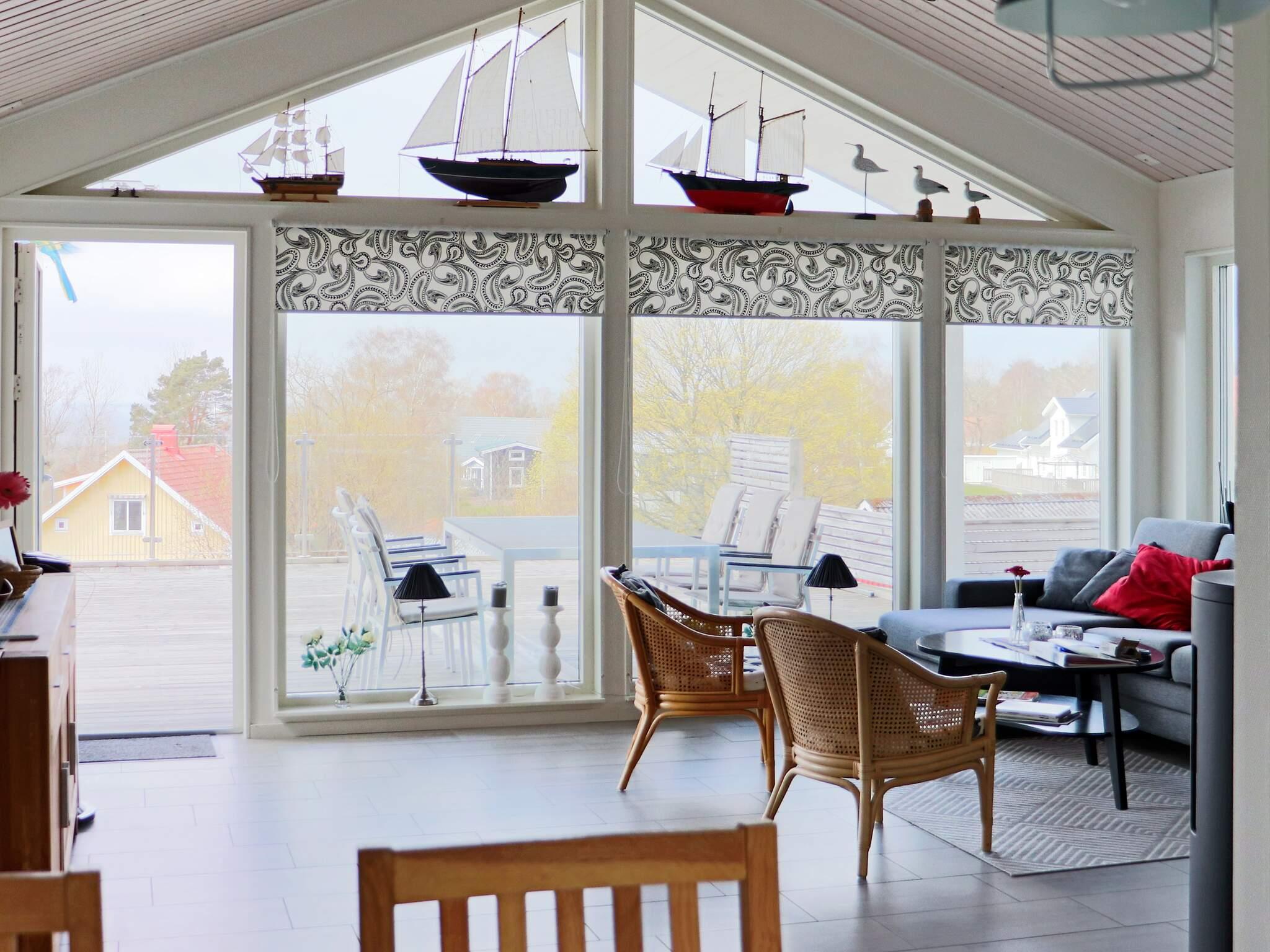 Från uppfarten för er en lång trappa er upp till den kuperade tomten. Från entrén på stugans baksida finns hallen och ett välutrustat badrum med tvättmaskin. Det finns ett större sovrum med en dubbelsäng och två mindre med vardera två enkelsängar. Husets hjärta är det vackra rymliga vardagsrummet med en härlig tak rymd och stora glaspartier mor altanen och havet. Här finns bekväma sittmöbler, modern TV och en värmande braskamin. Intill finns ett välutrustat kök med matplats. Huset har en behaglig golvvärme. Det finns gratis wifi. På husets baksida njuter ni av ert kaffe i morgonsolen. Den rymliga altanen och terrassen har utdragbara vindskydd och man kan spänna upp svalkande segeldukar som skuggar varma sommardagar.