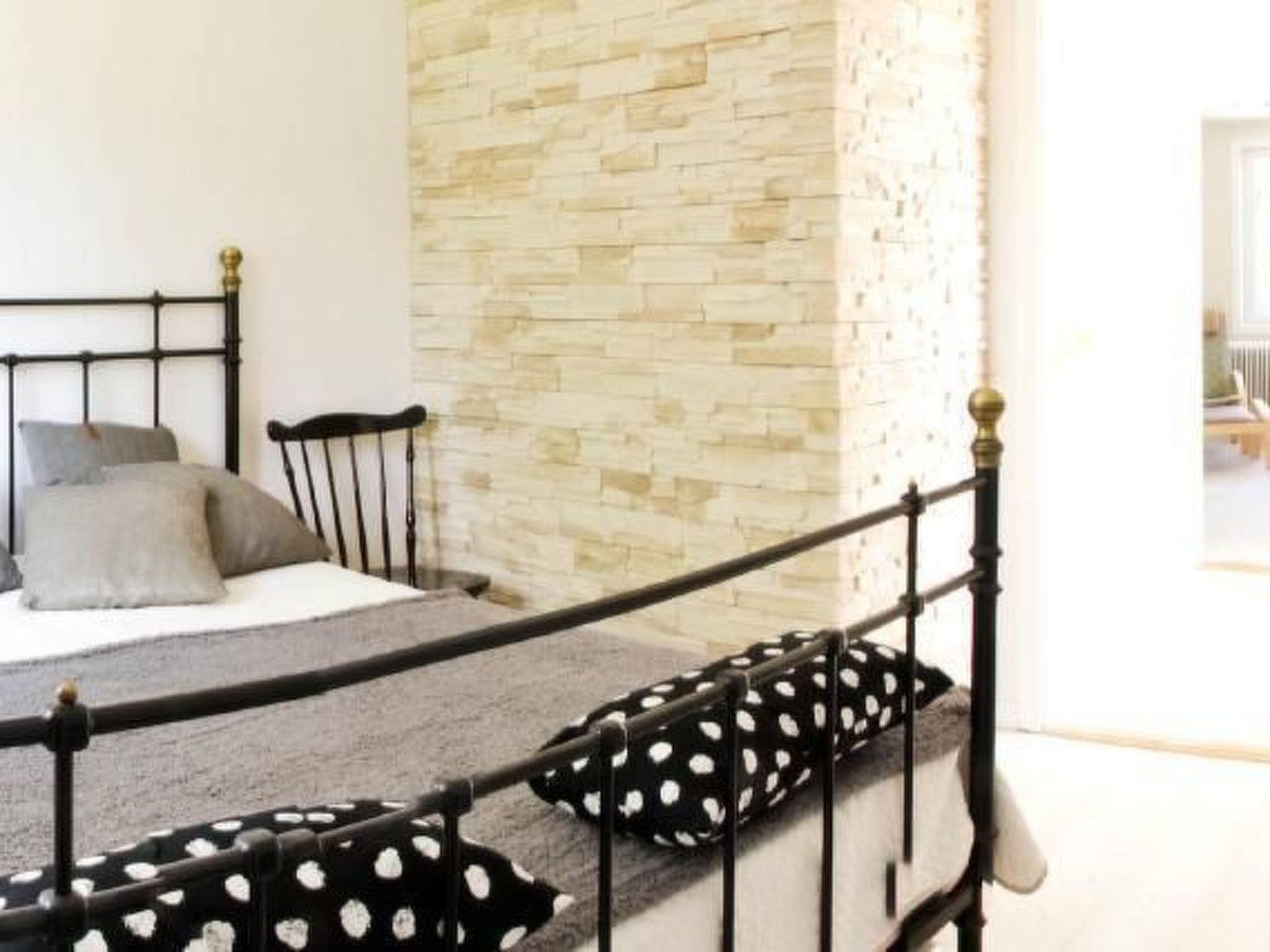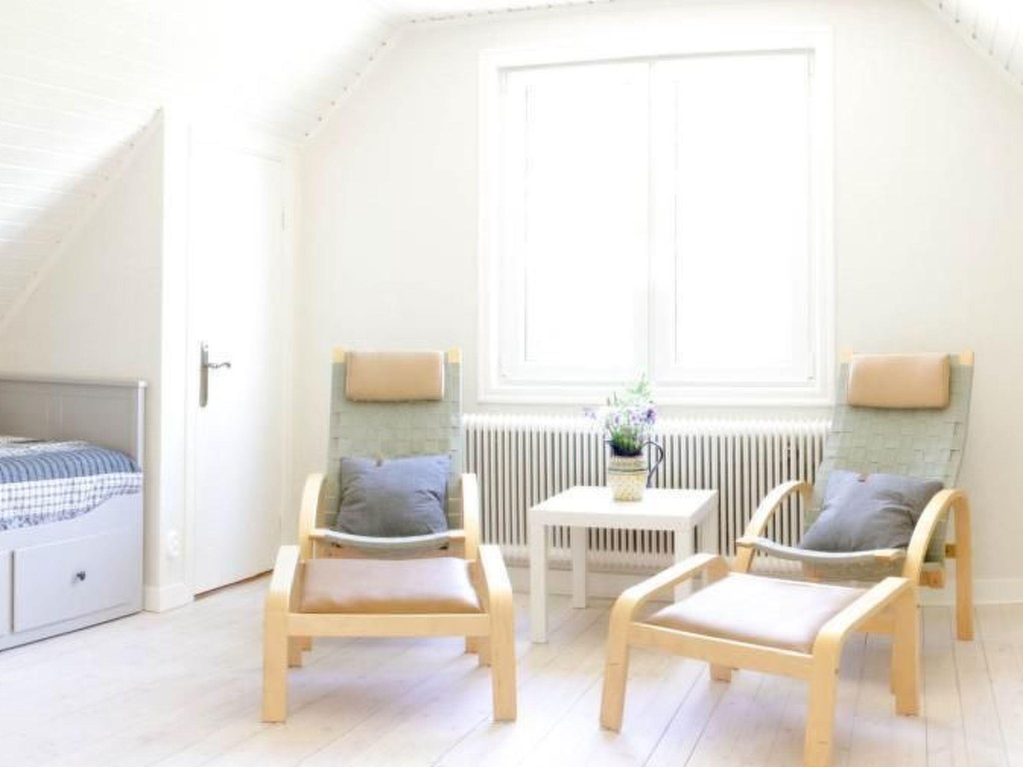 Both bedrooms are located on either side of the hallway. The large master bedroom is furnished with a double bed (1.60 x 2.00), two bedside tables, two typical Swedish "pin chairs" acting as bedside tables and a small wardrobe.