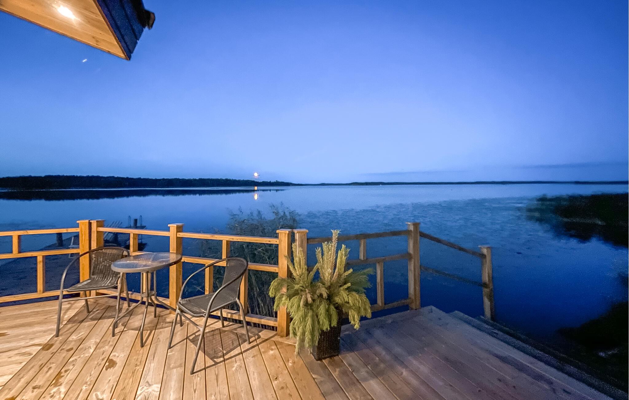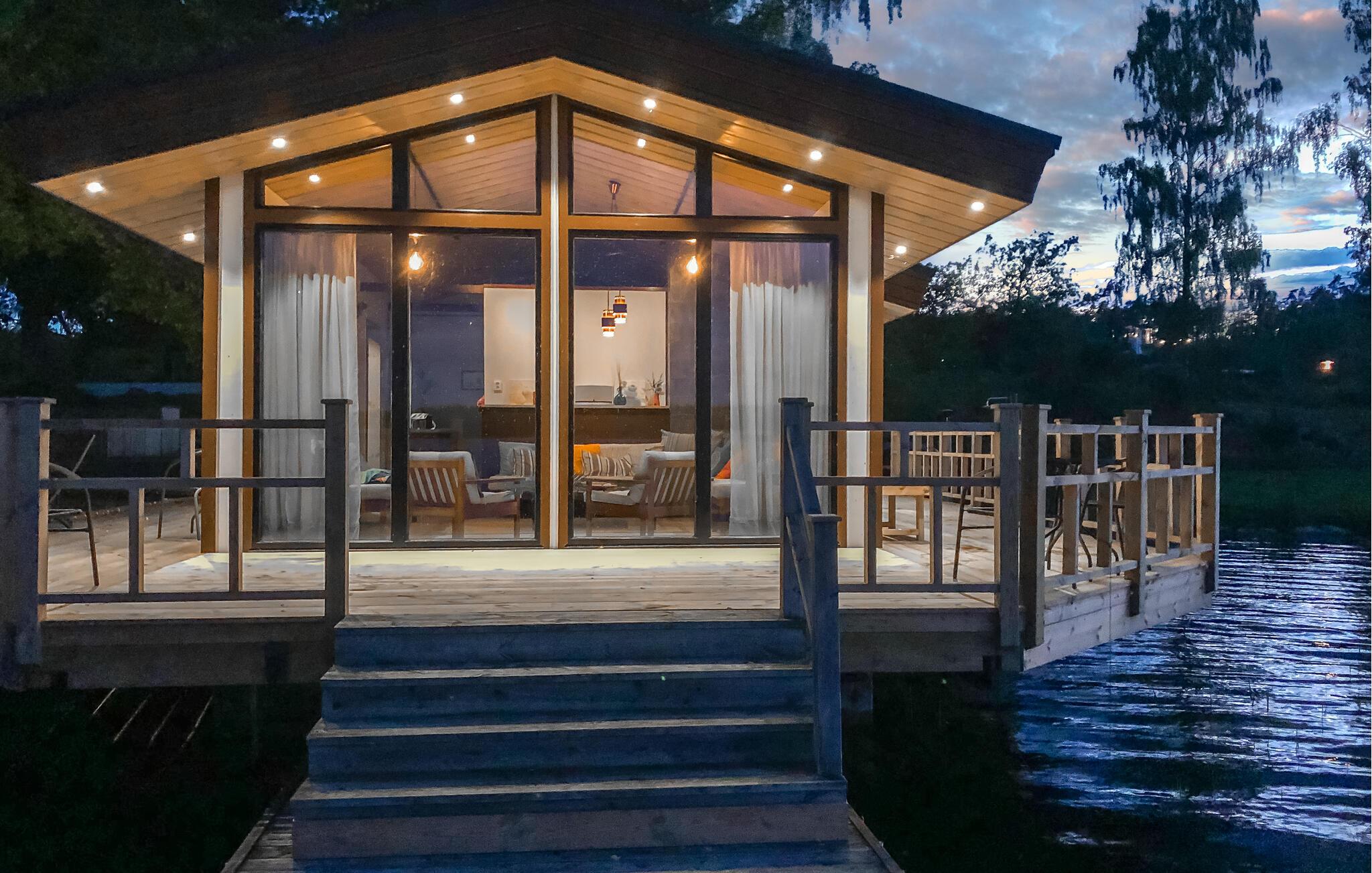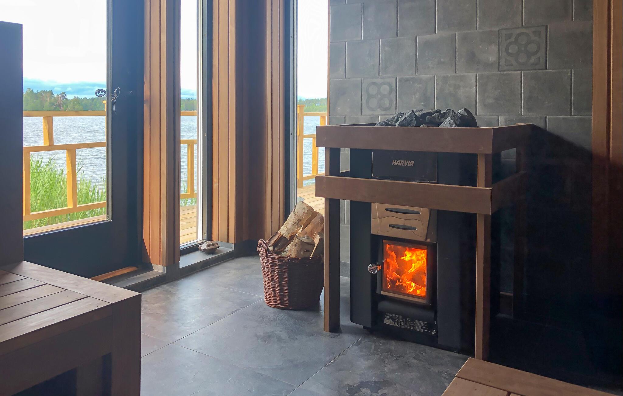Udenfor venter en stor, overdækket, sydvendt terrasse, ideel til afslapning med en betagende panoramaudsigt over Mälarens sø. En rummelig træterrasse forbinder huset med saunaen, som tilbyder masser af plads til afslapning. Udenfor finder I også et brændefyret spabad og et forfriskende udendørs brusebad.