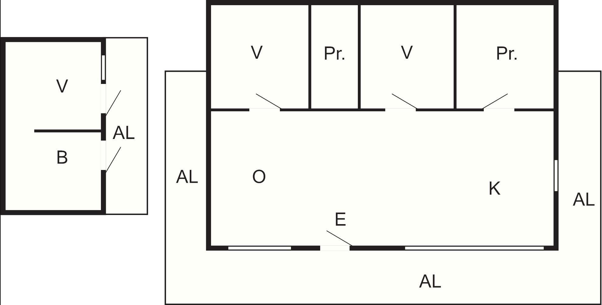 Det stora huset bjuder på högt till tak vilket ger rymd åt köksdelen med långbord att samla familj och vänner omkring. Här finns husets hjärta i form utav en vedspis att elda i för mysig värme och matlagning om man vill. Vanlig elspis med ugn, mikro och annan köks el finns också tillgängligt. Allrummet har även en soffgrupp för avkoppling och gemensamma stunder. Två sovrum i detta hus med dubbelsäng (140) i det ena och i det andra två bäddar, i form av en bädd med tillhörande utdragbar extrabädd.