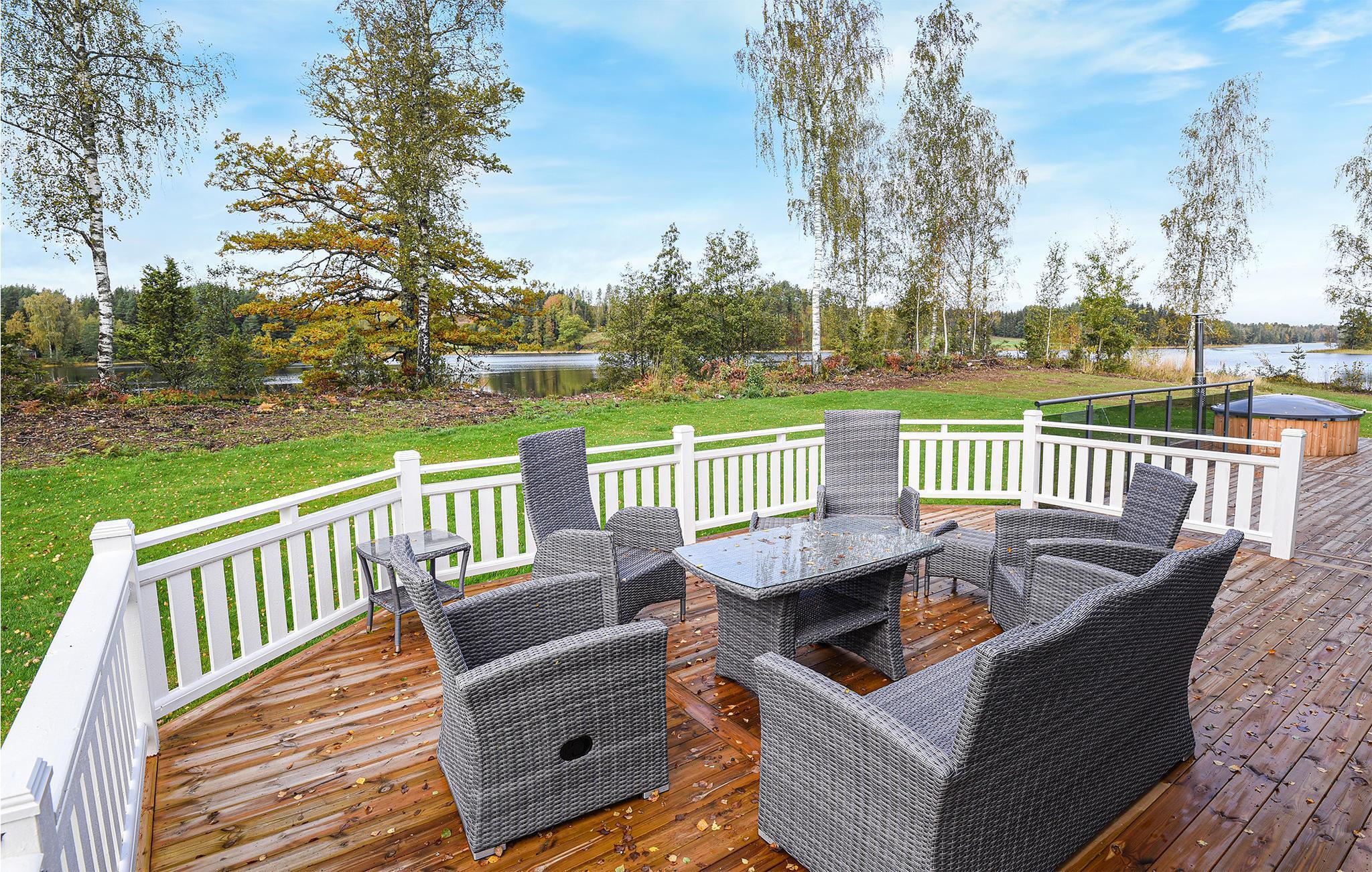 Velkommen til dette charmerende hjem for naturelskere. Glæd dig til at nyde panoramaudsigten over Eldansøen fra den store terrasse med indbygget brændefyret spabad. Man kan veksle mellem at bade i søen og gå i træsaunaen, som ligger kun 20 meter væk. Du kan udforske søen med din egen båd (motor kan lejes). Her kan du nyde totalt privatliv, både inde og ude, samt områdets ro og skønhed.
