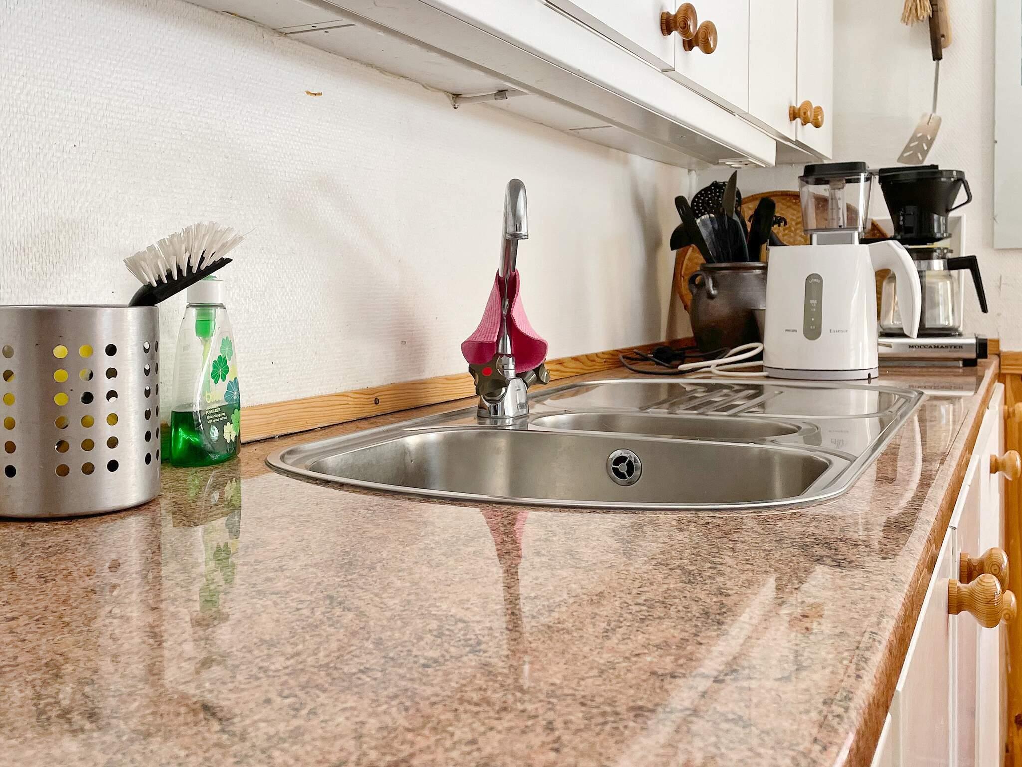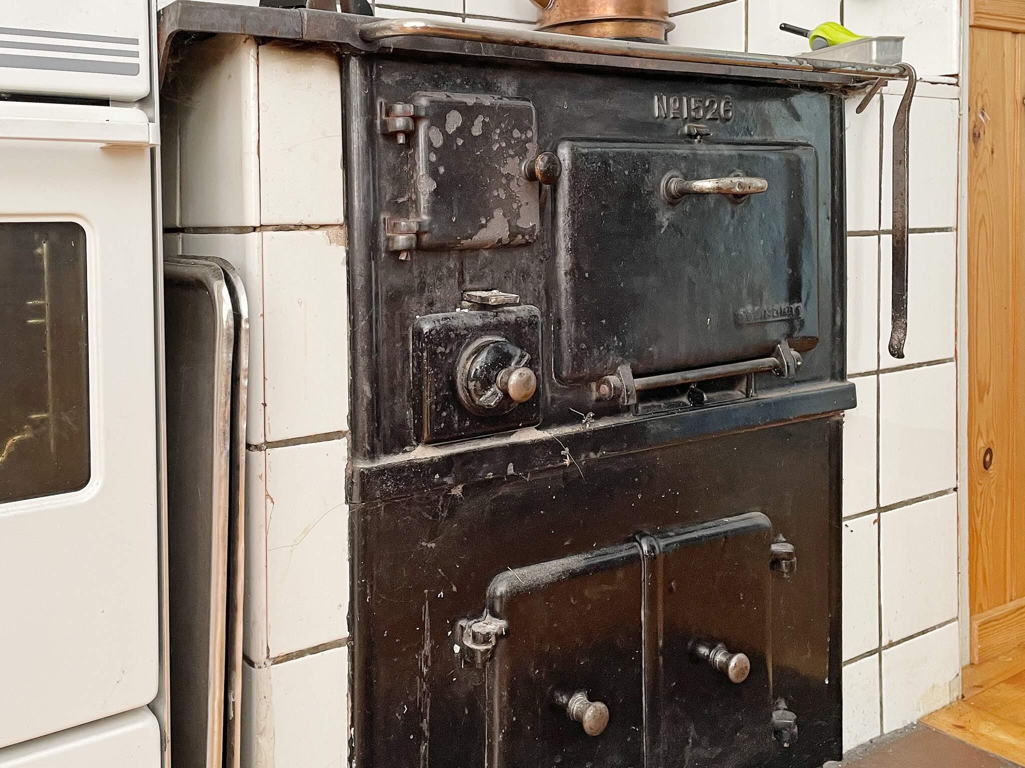 Køkken: El-komfur, køle-frys, mikroovn, brændekomfur, kaffemaskine, vand fra brønd