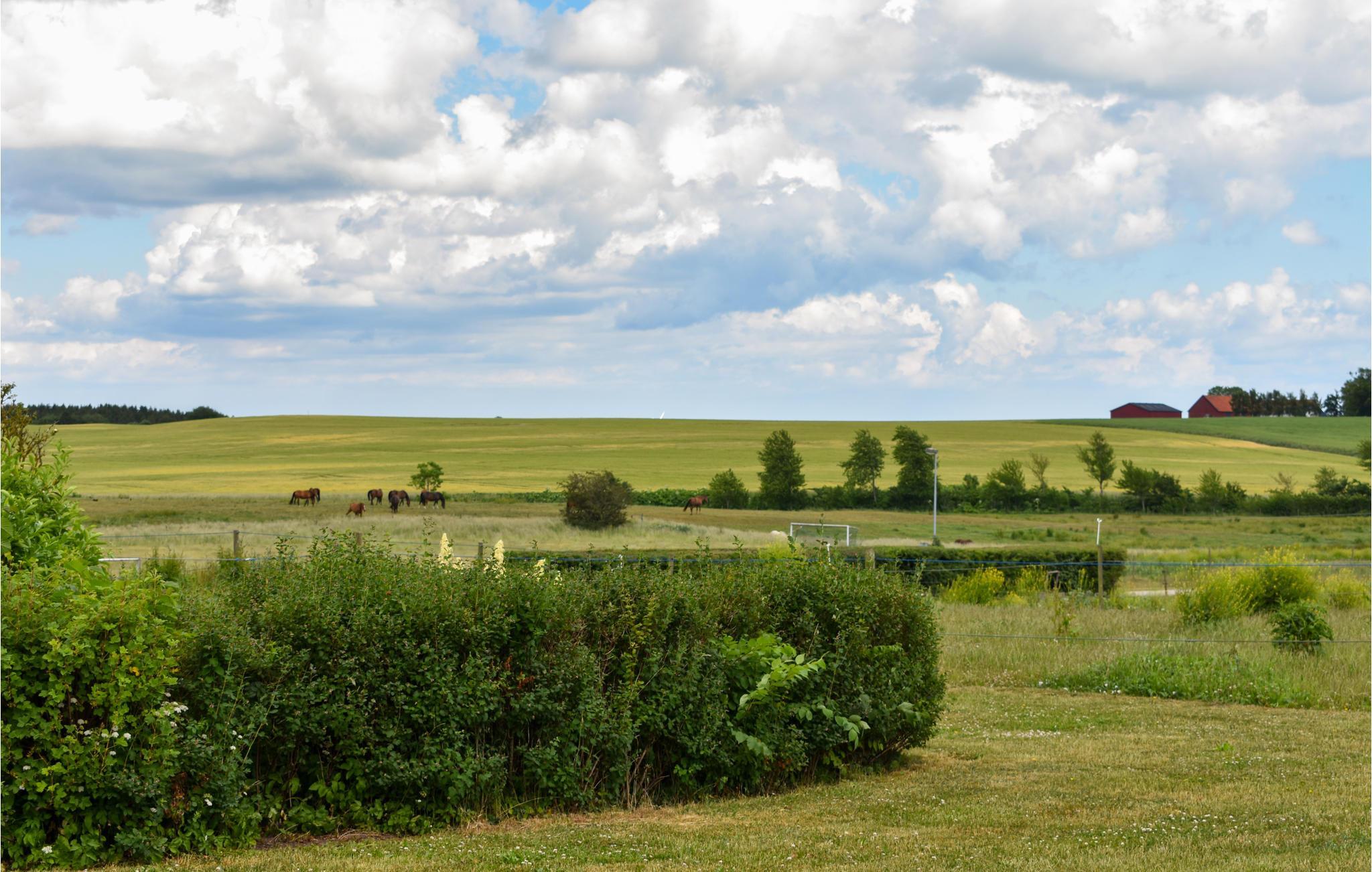 Nyd morgenkaffen udenfor og afslut dagen i den friske luft. Udendørsområdet med siddepladser lægger op til afslappende timer. Fra ejendommen har I frit udsyn over marker og enge. Se heste græsse eller slentre langs gårdens grund. Den direkte beliggenhed på gården formidler virkeligt landliv.