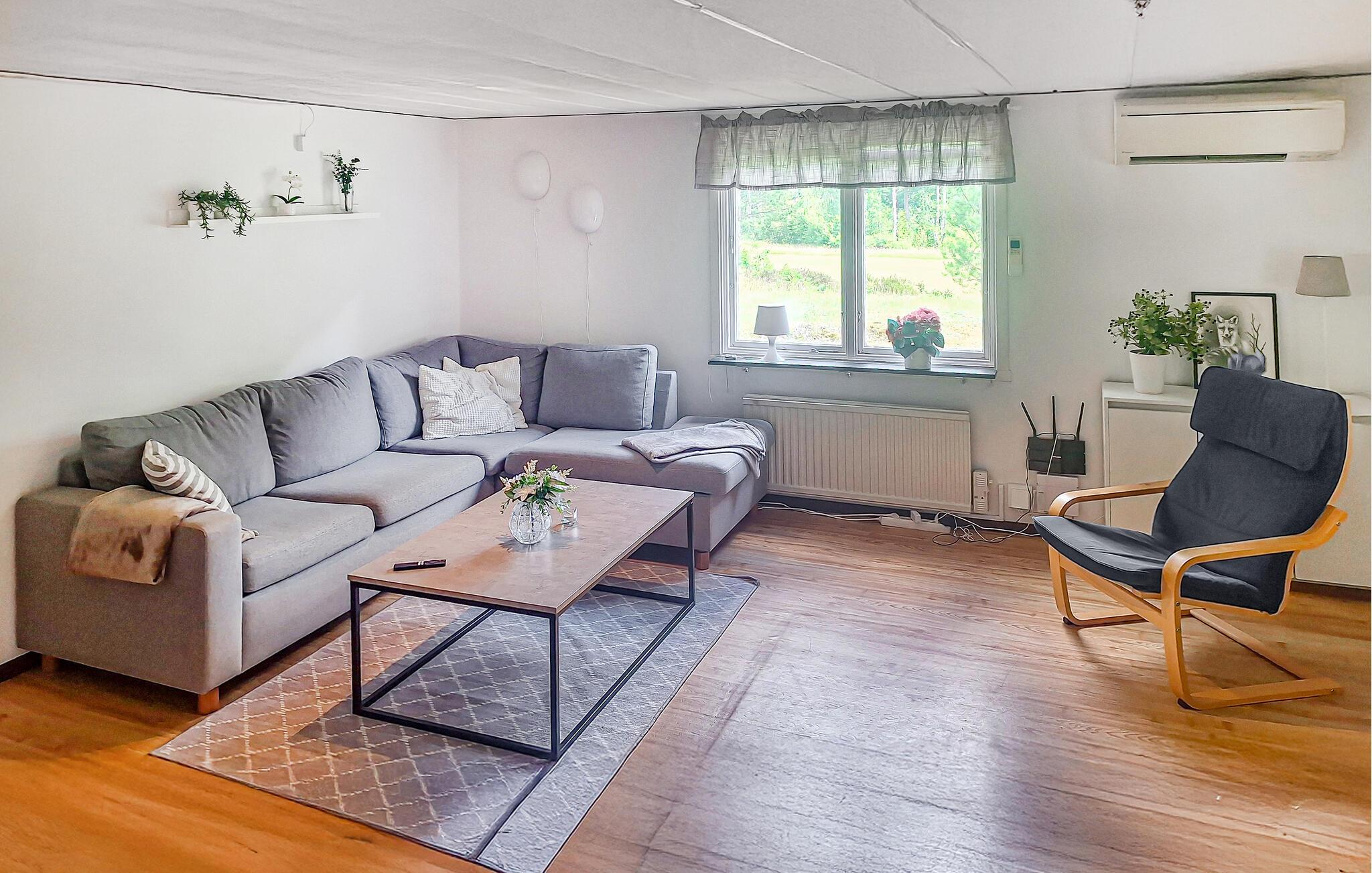 Veludstyret og moderne feriehus med indbygget uderum med glasdøre og terrasse. Huset ligger i nærheden af Torpa i Småland. Her er flisebadeværelse og centralstøvsuger. Uforstyrret og smuk beliggenhed med en dejlig sø lige i nærheden, søen kan skimtes mellem træerne. I søen Mäen kan I fiske efter gedde, sandart og aborre. I kan spadsere lange ture, cykel – eller bare holde ferie og slappe af og nyde de forskellige årstider. Der er flere naturreservater i nærheden. Store dejlig plæne til leg og boldspil. Køb ind i Ljungby eller Halmstad.