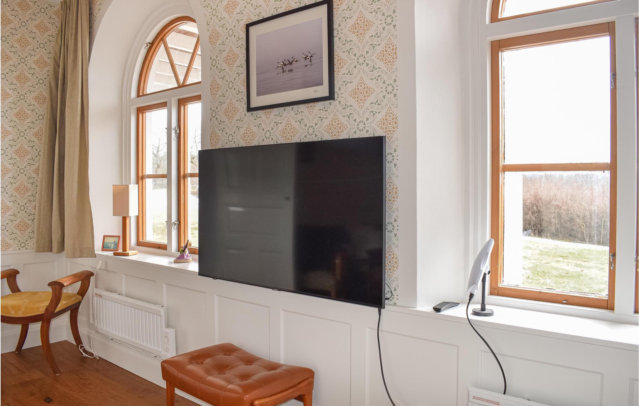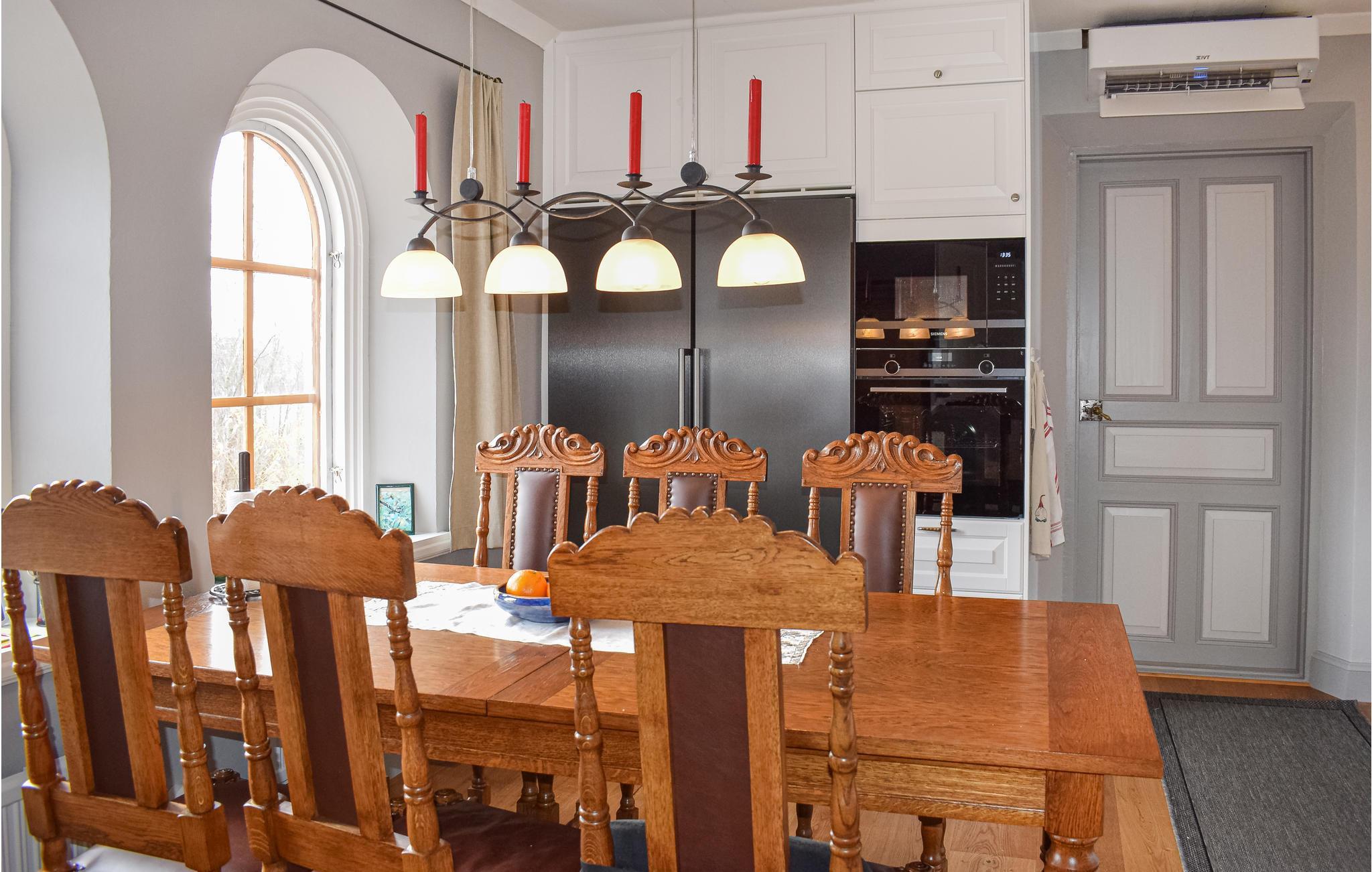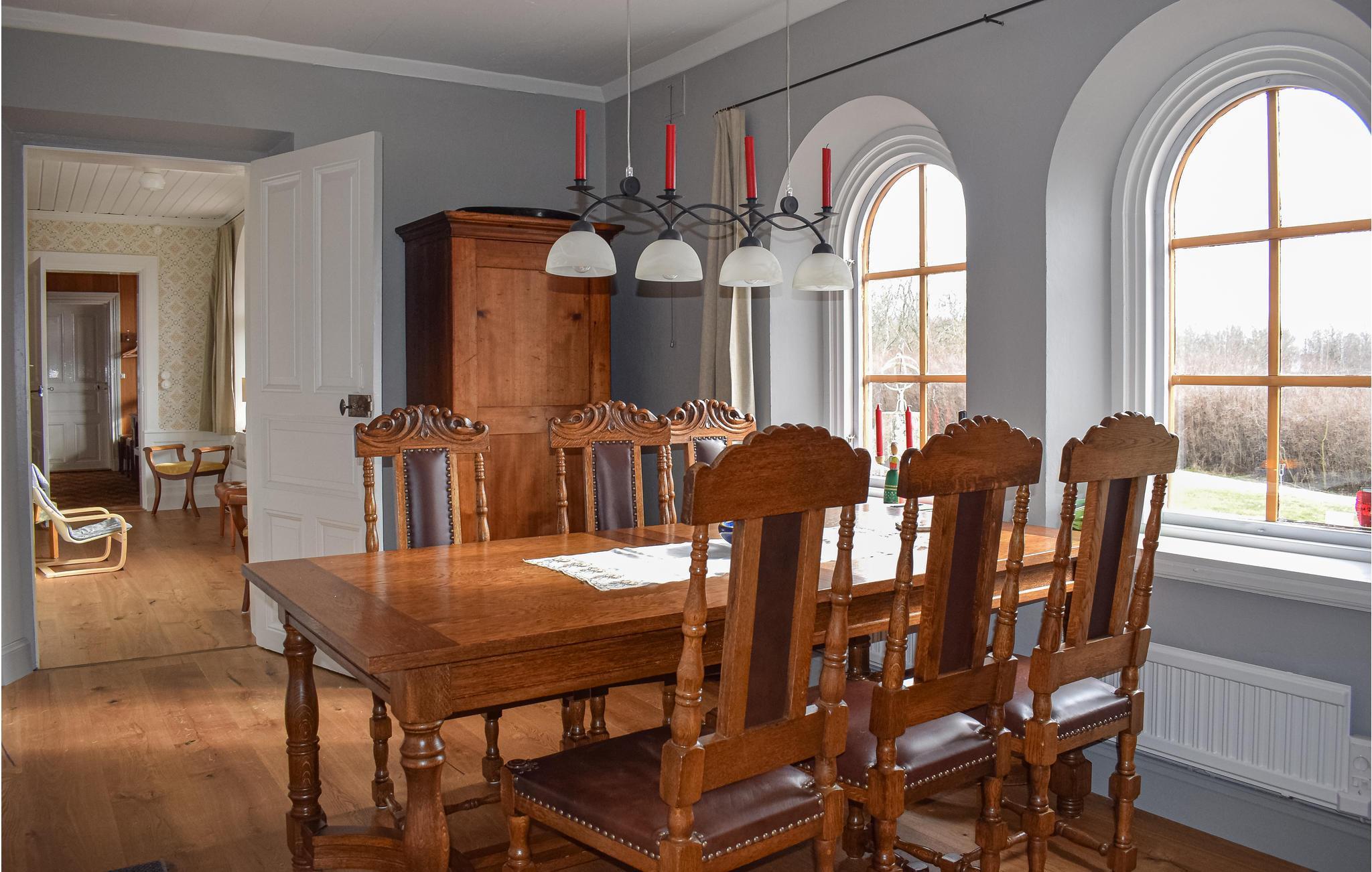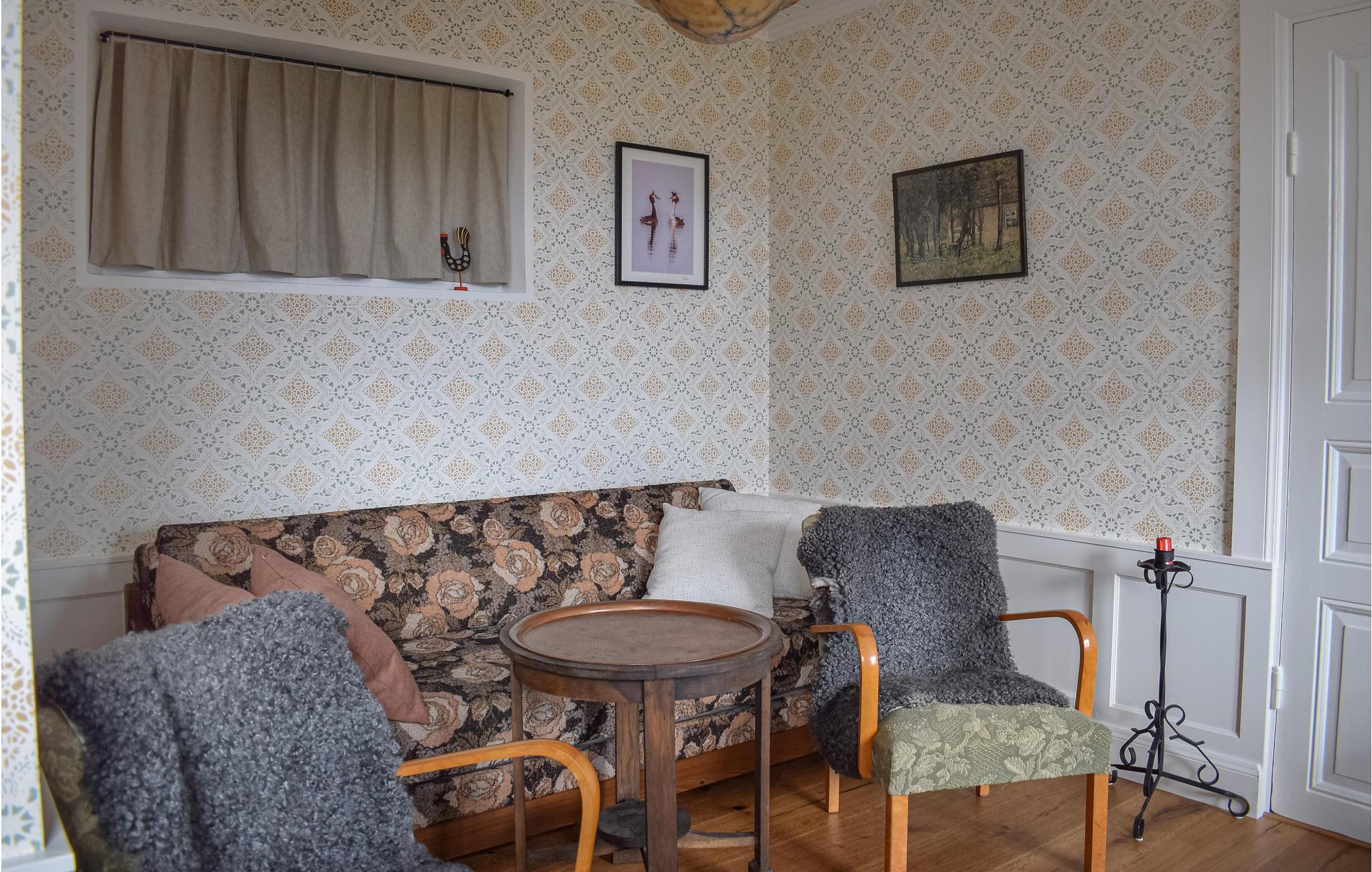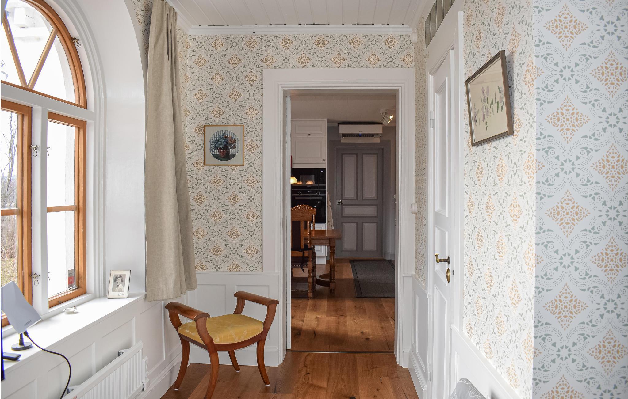 Dette smukke feriehus ligger på herregården Åbonäs Säteri. I bor i den vestlige fløj af det elegante hus. De 2 soveværelser med dobbeltsenge og 2 ekstra senge i stuen har plads til 6 personer, som kan holde fri i herskabelige omgivelser.