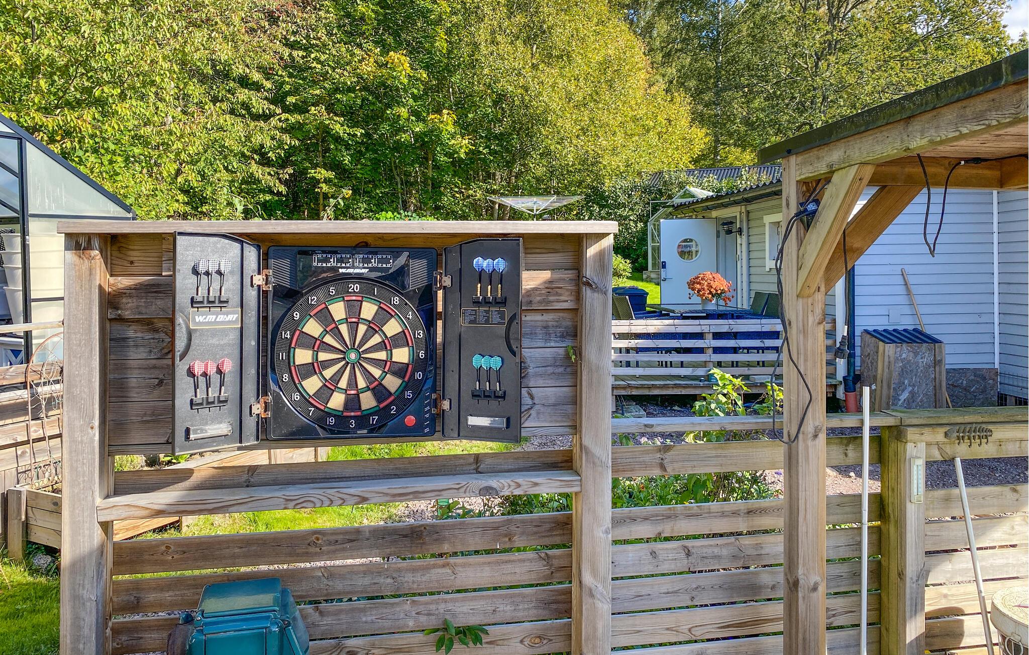 Forkæl jer selv med en tur i udendørs whirlpoolen, som er ideel til at lade sjælen dingle. For underholdning er der dartskiven i haven, hvor I kan teste jeres præcision. I stuen venter hyggelige siddepladser, som inviterer til afslapning, og den smukke vinterhave sørger for en bekymringsfri og rolig atmosfære.