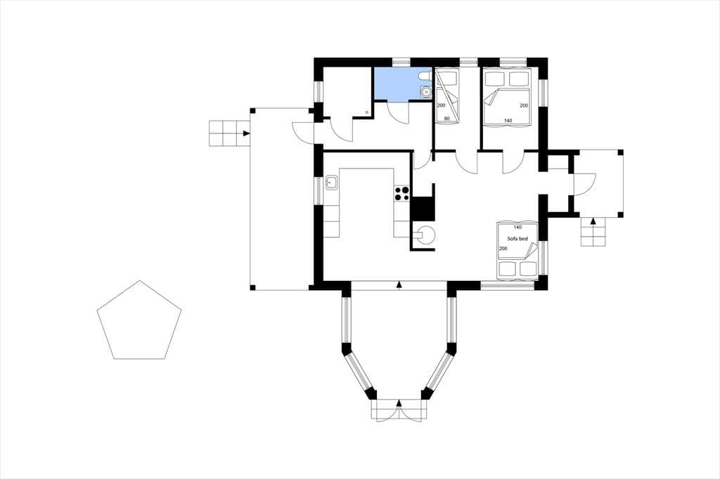 Når du træder ind i det ca. 70 m² store sommerhus, bliver du mødt af en åben stue med to sofaer, brændeovn og et tv, hvor du kan caste fra din mobil, tablet eller computer, ved at logge på wifi’et. Når du går længere ind, kommer du til spisestuen, hvor der er store vinduer med udsigt ud over søen, så du også kan sidde indenfor og nyde udsigten. I køkkenet findes der en ovn, 2 kogeplader, en lille opvaskemaskine, mikroovn, kaffemaskine, elkedel og de ellers nødvendige ting som findes i et køkken. I huset er der 2 soveværelser med henholdsvis 1 køjeseng i det ene værelse og et dobbeltseng (140 cm bred) i det andet værelse. Derudover er der mulighed for at slå sovesofaen (som bliver til en 140 cm bred seng) ud inde i stuen, så der yderligere kommer 2 sovepladser. Derudover er der i annekset 2 sovepladser som er 2 enkeltmandssenge (80 cm brede). Der er et toilet i huset med håndvask. Ved siden af er der et større rum, hvor der er sauna og et brusebad. Huset har koldt og varmt vand og kan opvarmes elektrisk eller med brændeovnen. Udenfor finder du en lille overdækket terrasse med bord og stole, hvor man kan sidde om aften og nyde udsigten over søen. Derudover er der gratis internet, en robåd og en grillhytte / grillstuga på grunden samt udendørs bålsted, hvor der kan grilles.