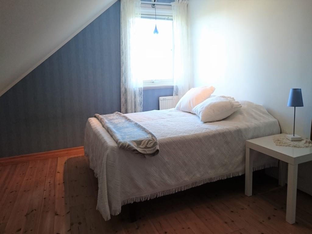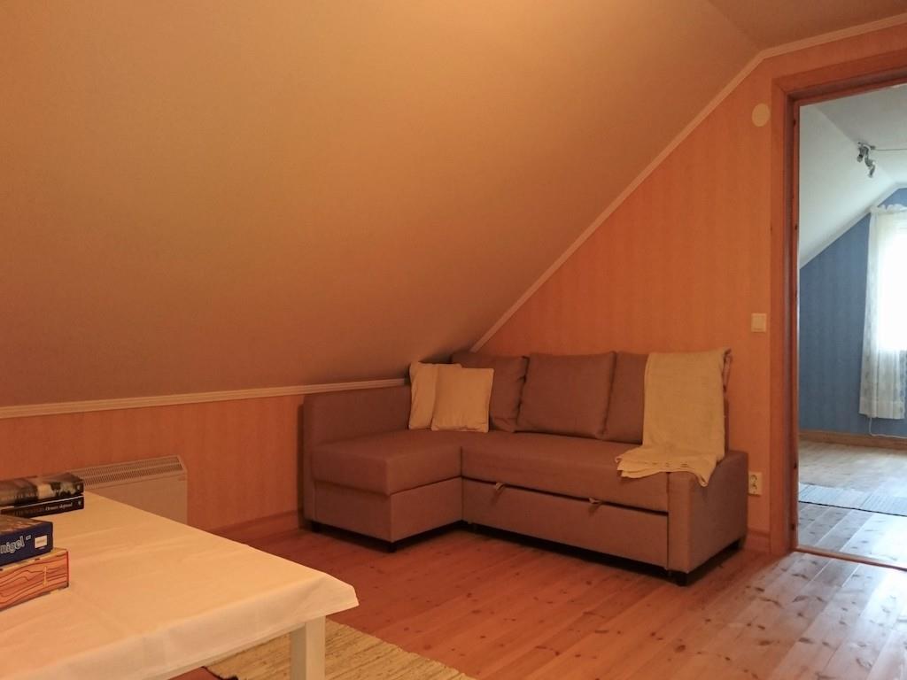 På førstesalen er der et værelse med en 160 cm bred sovesofa samt et badeværelse med vaskemaskine, brusekabine og toilet. Der er også et større soveværelse, som er opdelt i to: I den ene del er der to 90-cm brede enkeltsenge samt en juniorseng og i den anden del er der yderligere to 90-cm brede enkeltsenge (der er ikke dør mellem soveværelserne). Det er muligt at låne en gæsteseng, hvis der er behov for det.