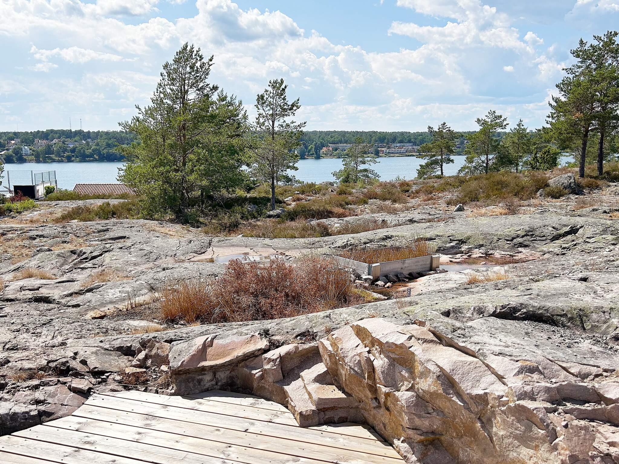 Då huset ligger på toppen av en kulle finns även kuperad terräng ner till badstranden. Badplatsen tillhör alla fritidshus i området.