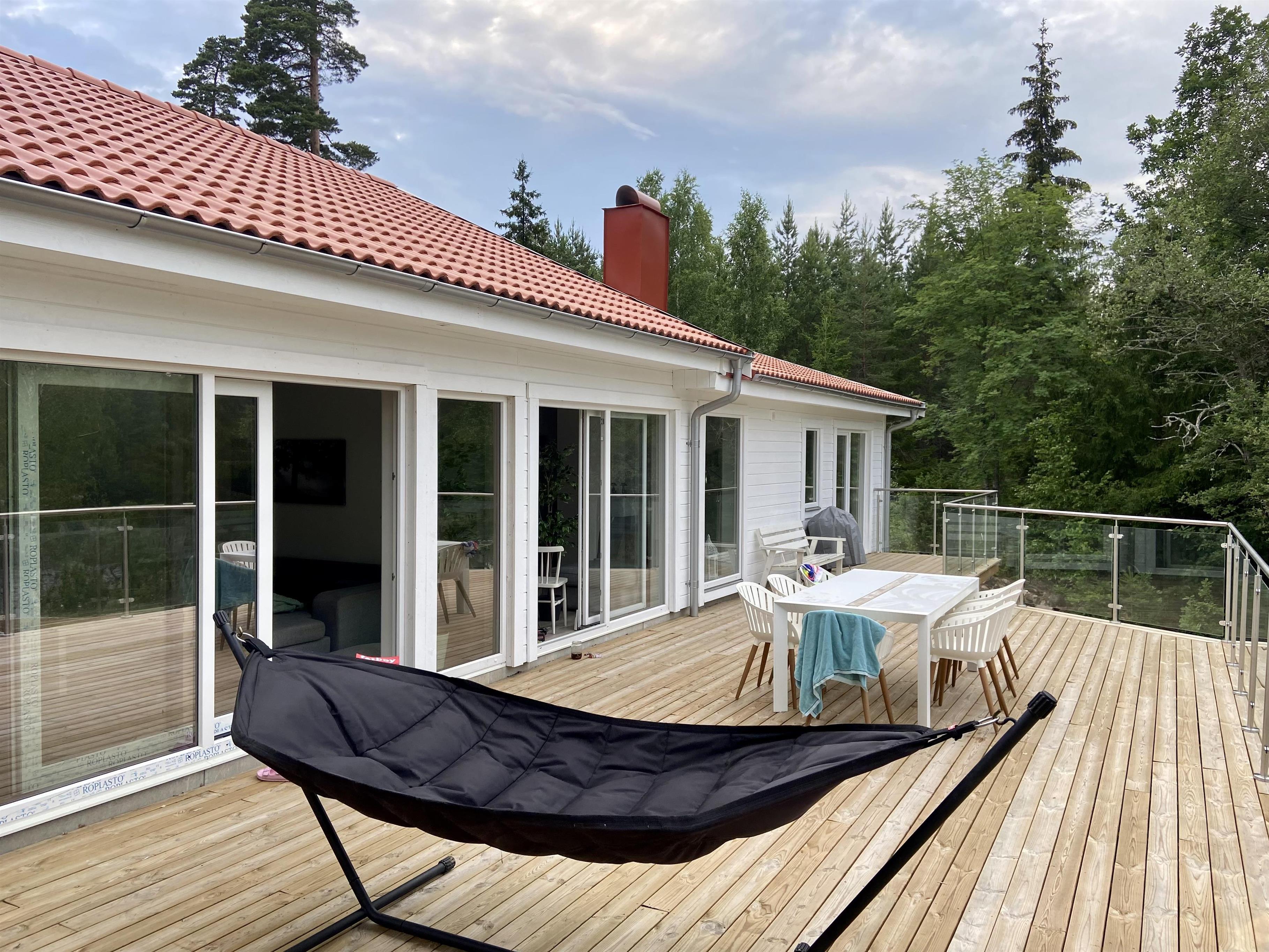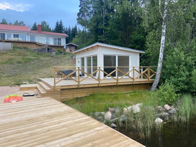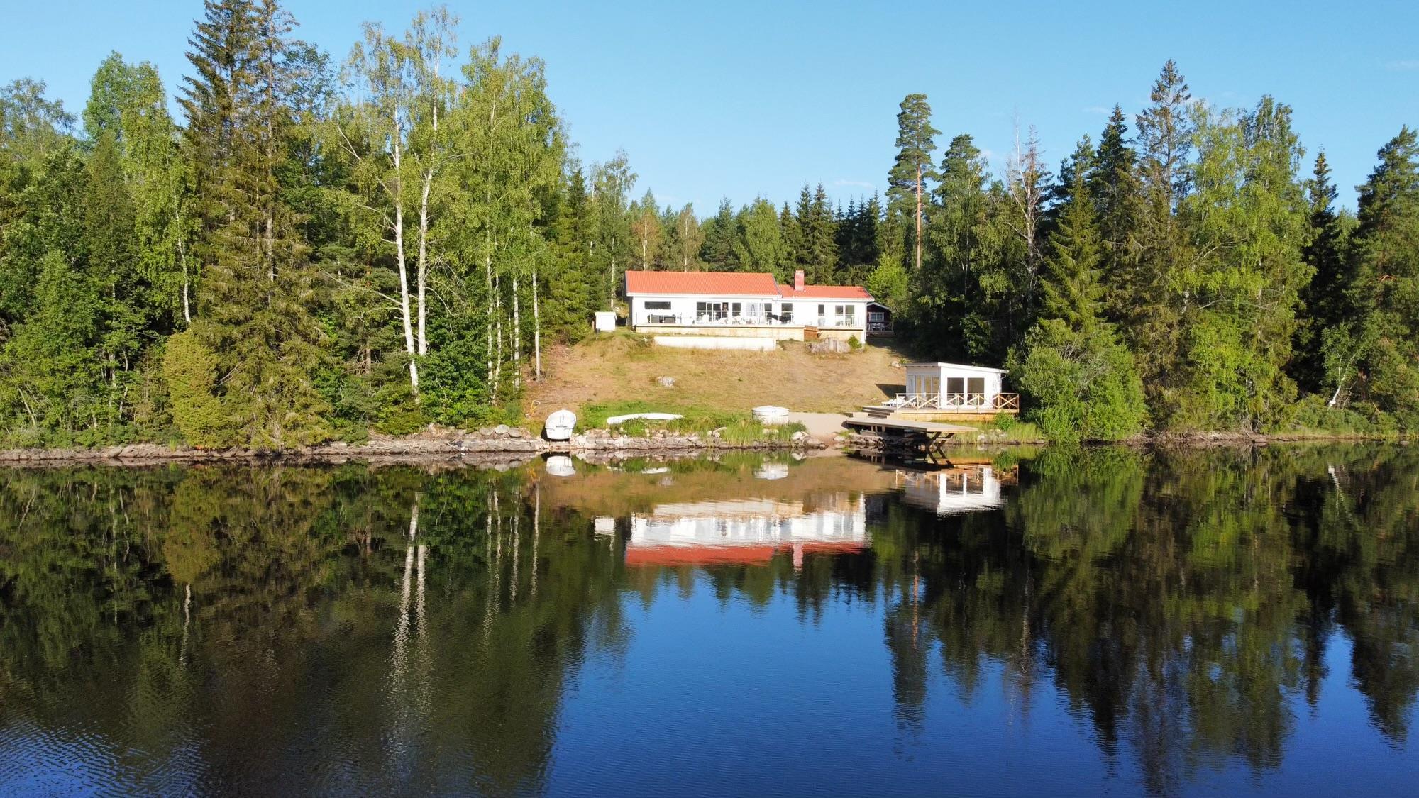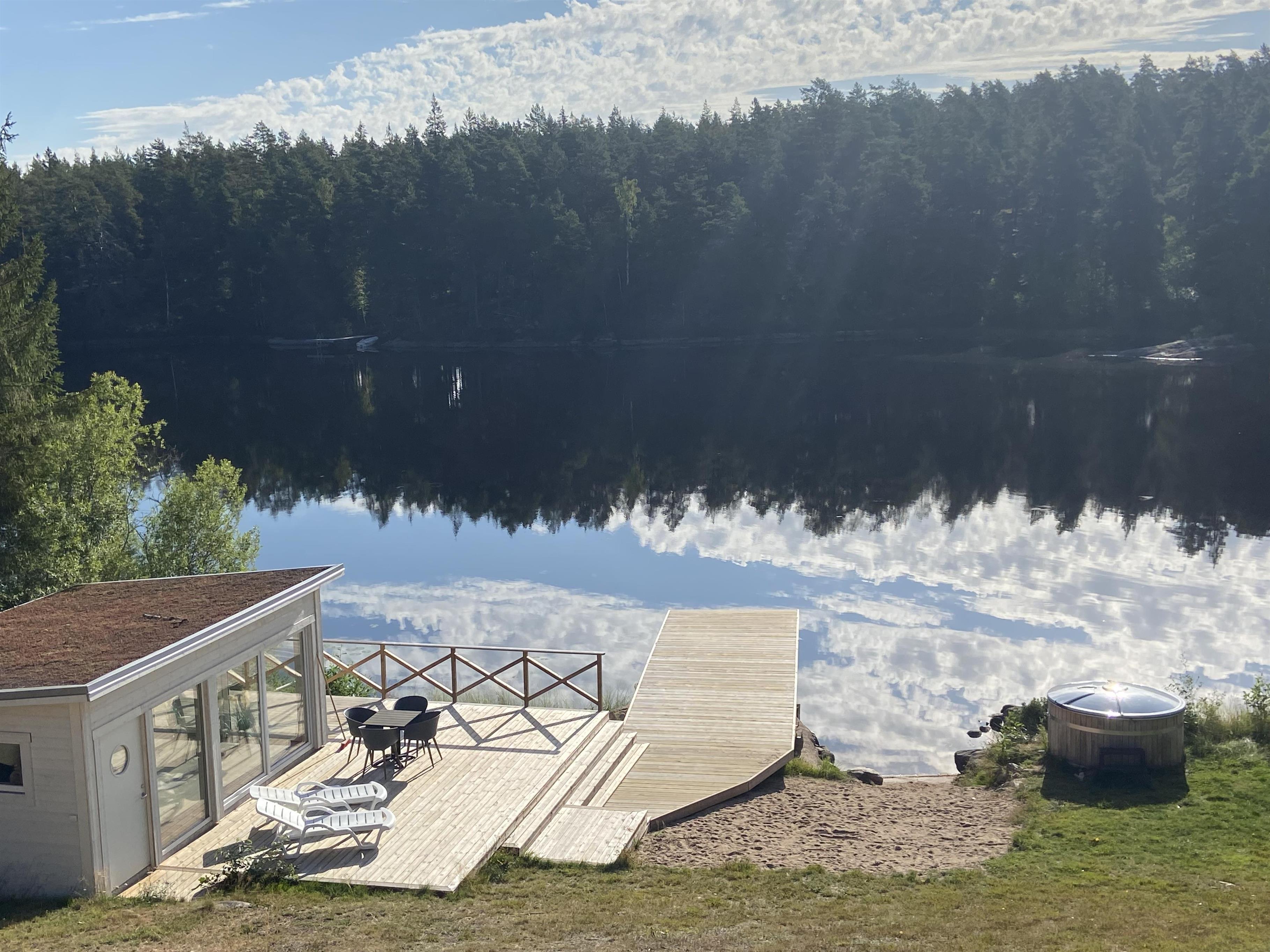 Her har I egen sandstrand på grunden. Ingen naboer i nærheden, bortset fra den nærmeste nabo, der bor ca. 300 meter væk. Feriehuset ligger i en vig ved søen Nedre Bjärken.