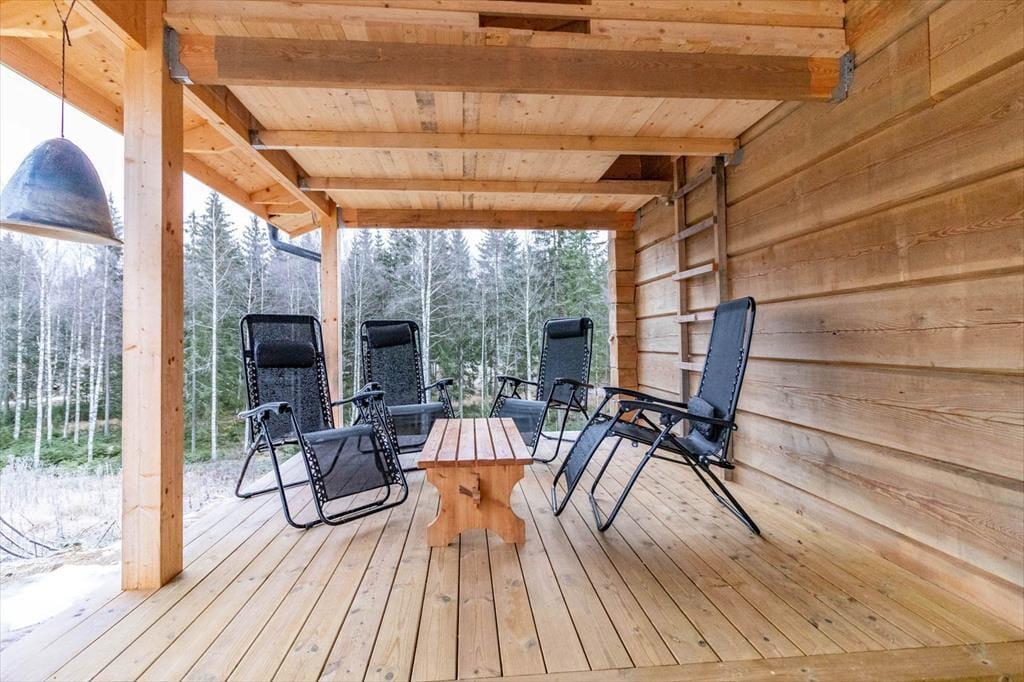 Der er tre soveværelser – to med dobbeltsenge (140 cm brede) og ét med to enkeltsenge. I stuen findes desuden en hjørnesofa, der kan bruges som sovesofa ved behov. Huset opvarmes med elvarme. Udenfor venter en overdækket terrasse med søudsigt, komfortable havemøbler og grill. Over terrassen er der desuden et lille legehus-loft til børn.