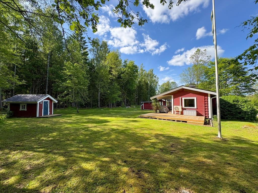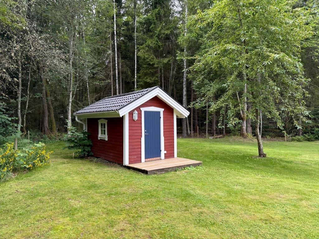 Dette feriehus ligger på en ca. 1.550 m² stor enggrund, kun ca. 300 m fra en badebro i den store, forgrenede sø Åsnen. Den nærmeste indkøbsmulighed finder du i »Lanthandel« i Kalvsvik, kun ca. 1.000 m væk. Der er mange butikker og hyggelige caféer i universitetsbyen Växjö, der ligger kun ca. 27 km væk, hvor du ud over glas- og emigrantmuseet også kan besøge domkirken med et glasalter af den berømte glaskunstner Bertil Vallien.