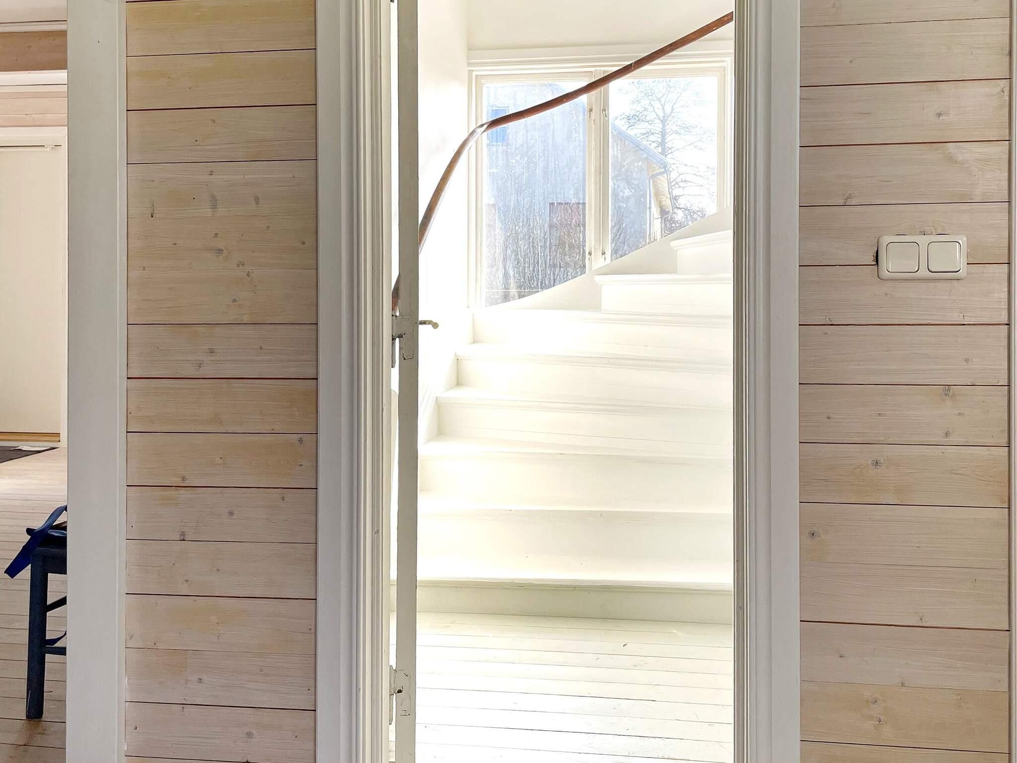 Trappen upp är en äldre större trapp via köket. Här kommer man till huset vardagsrum med tv hörna och skön soffgrupp. Huset tredje stora sovrum är här uppe med ytterligare en dubbelsäng på 180 cm och stor garderob.. Här uppe finns huset andra badrum med badkar där man står i för dusch, två handfat och allt är precis som i övriga huset, rymligt och mycket trivsam och varm inredning.