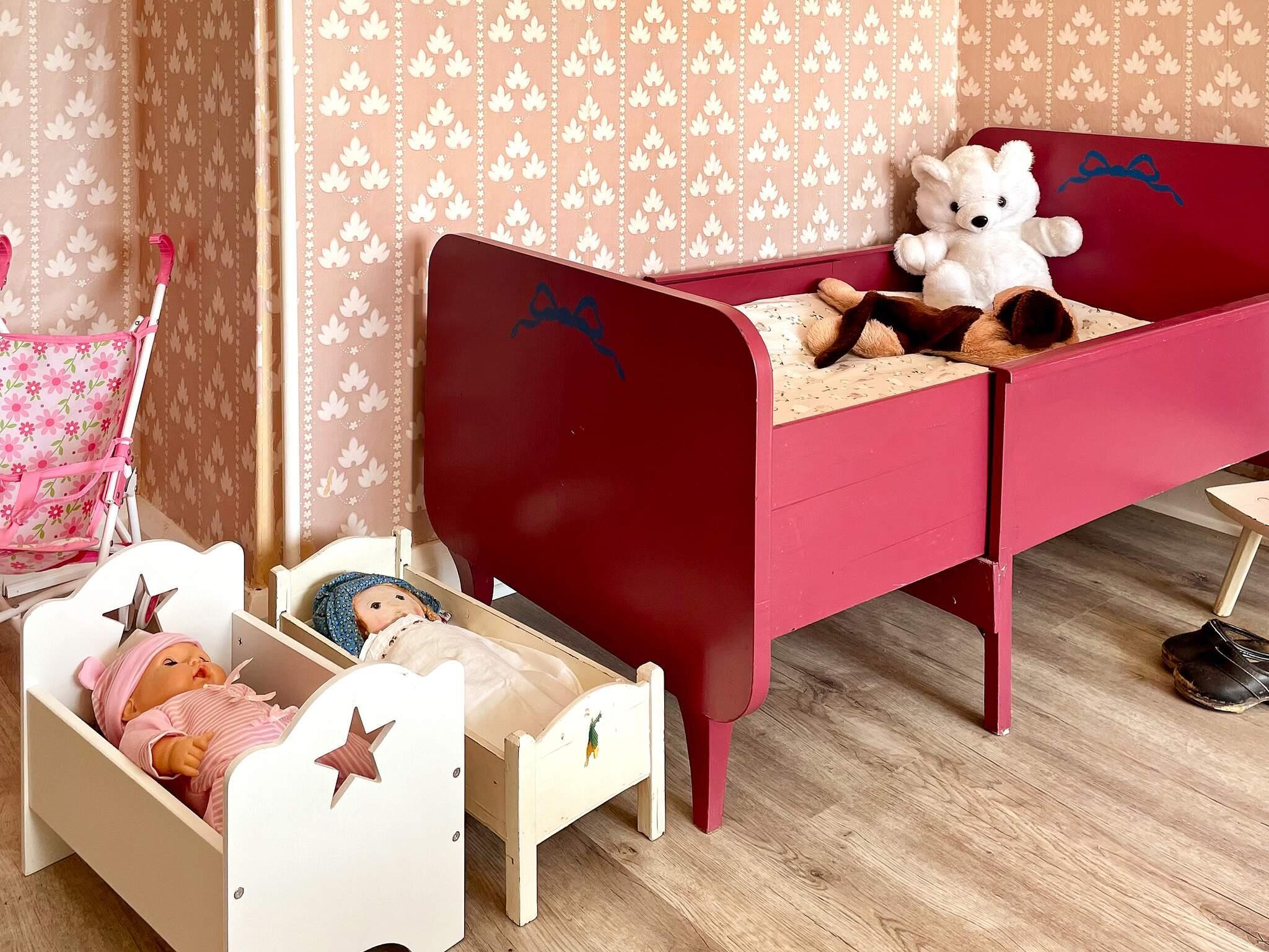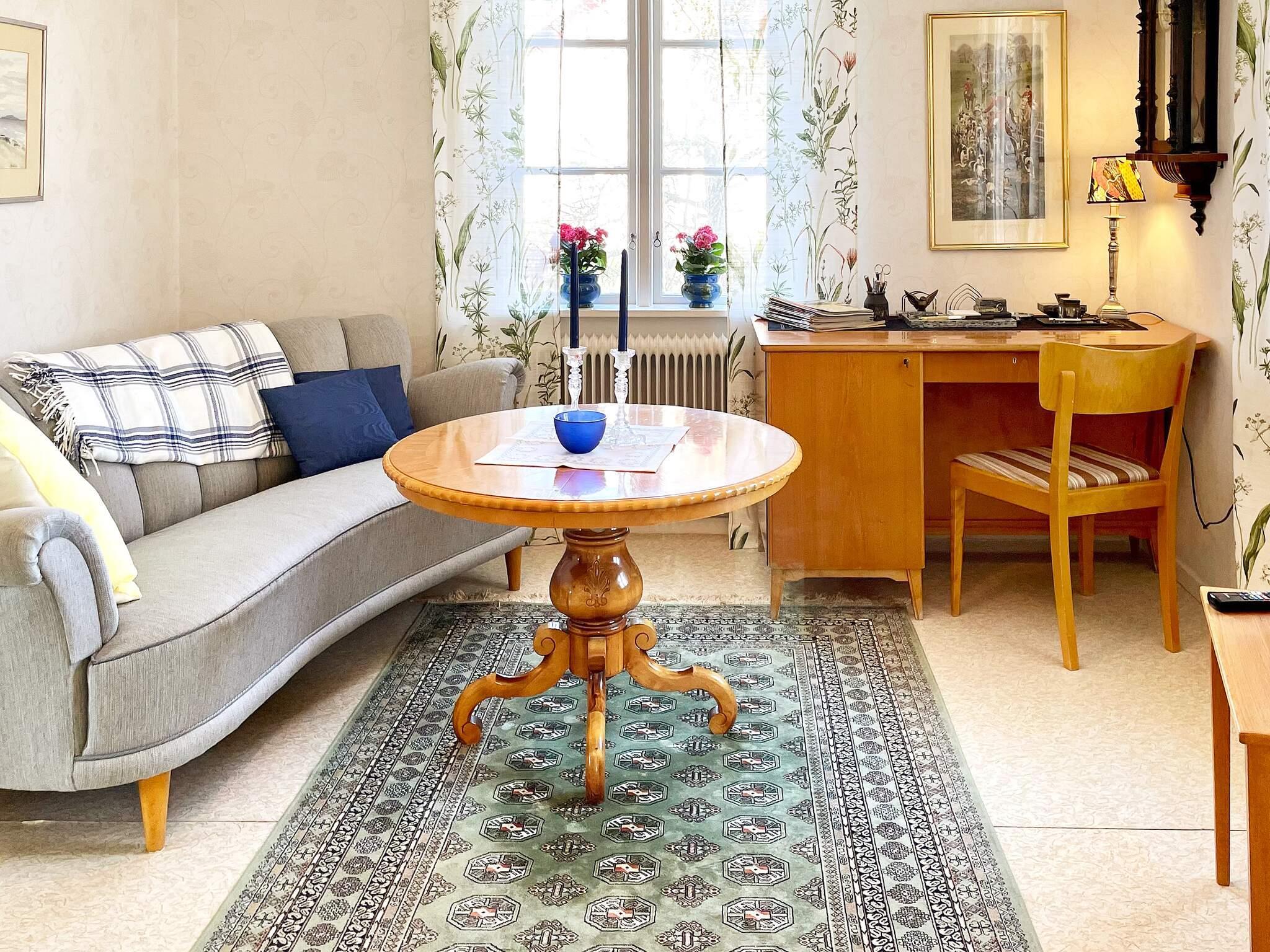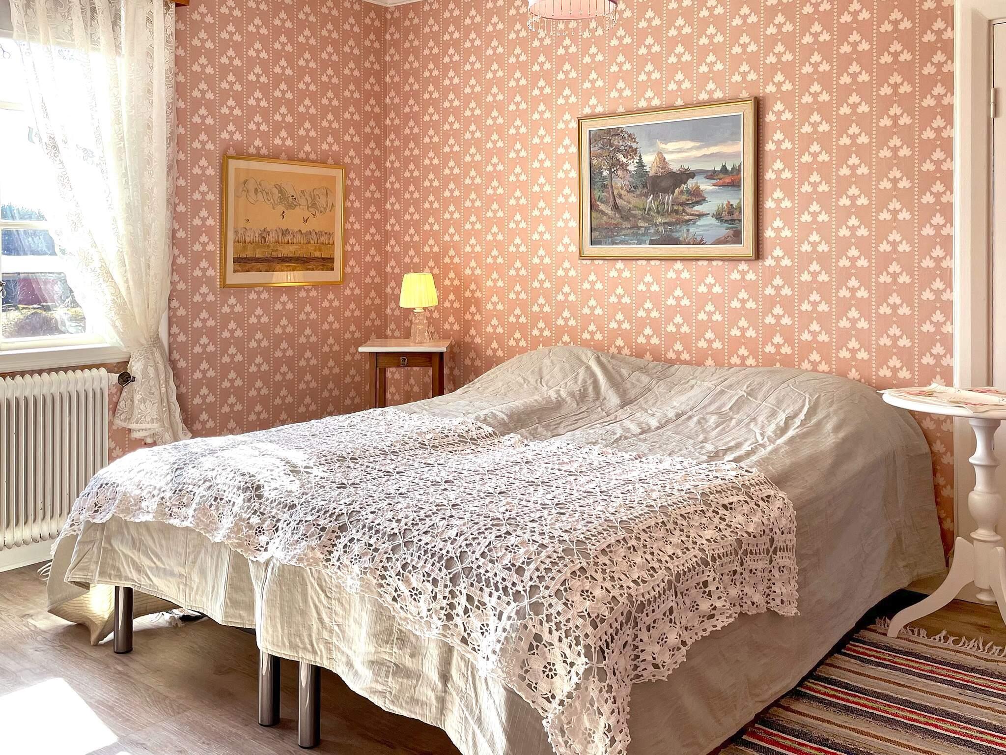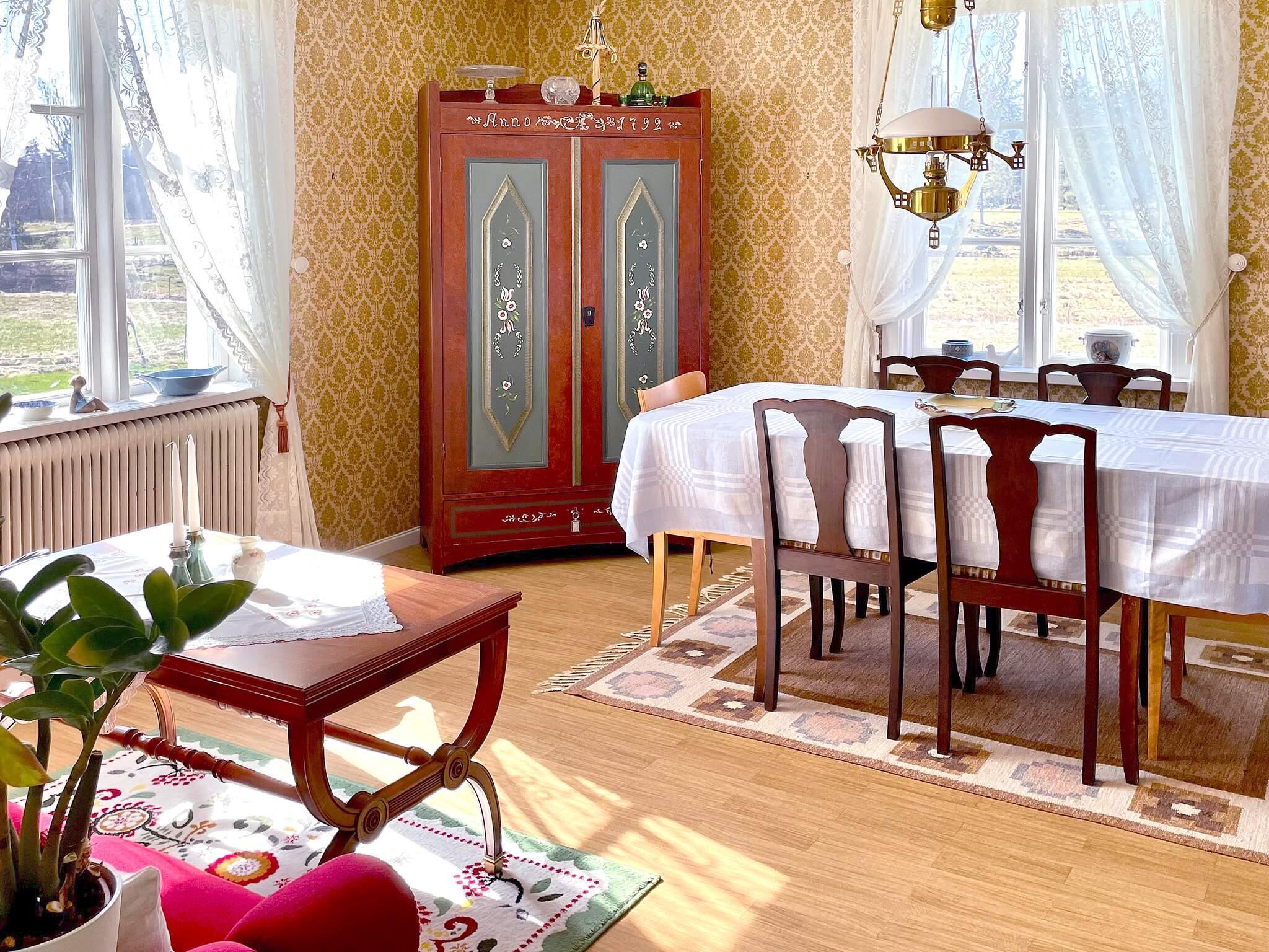 Huset har en stor trädgård med utemöbler och diverse fruktträd som kantas av en vacker gärdsgård åt ena hållet. Här kan ni njuta av naturen och de fina vyerna. Ni har ett stort kök med matplats samt det mesta ni kan komma att behöva. Det finns hela tre sällskaps rum. I det största finns matplats och soffmöbler. Det minsta är en vacker matsal. Det tredje har en soffa och skrivbord.