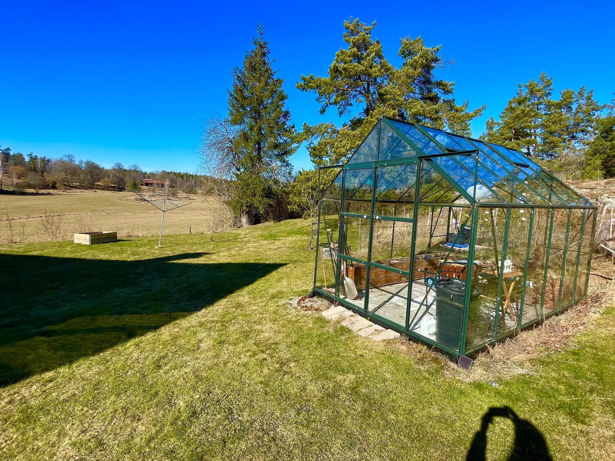 Det finns ett trevligt växthus där ni gärna får smaka tomater och gurkor om det finns.