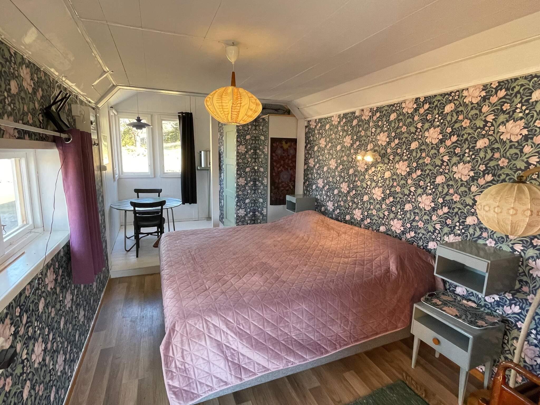I den söta gäststugan finns en dubbelsäng samt en liten vardagsrumdel med altandörrar ut mot altanen.