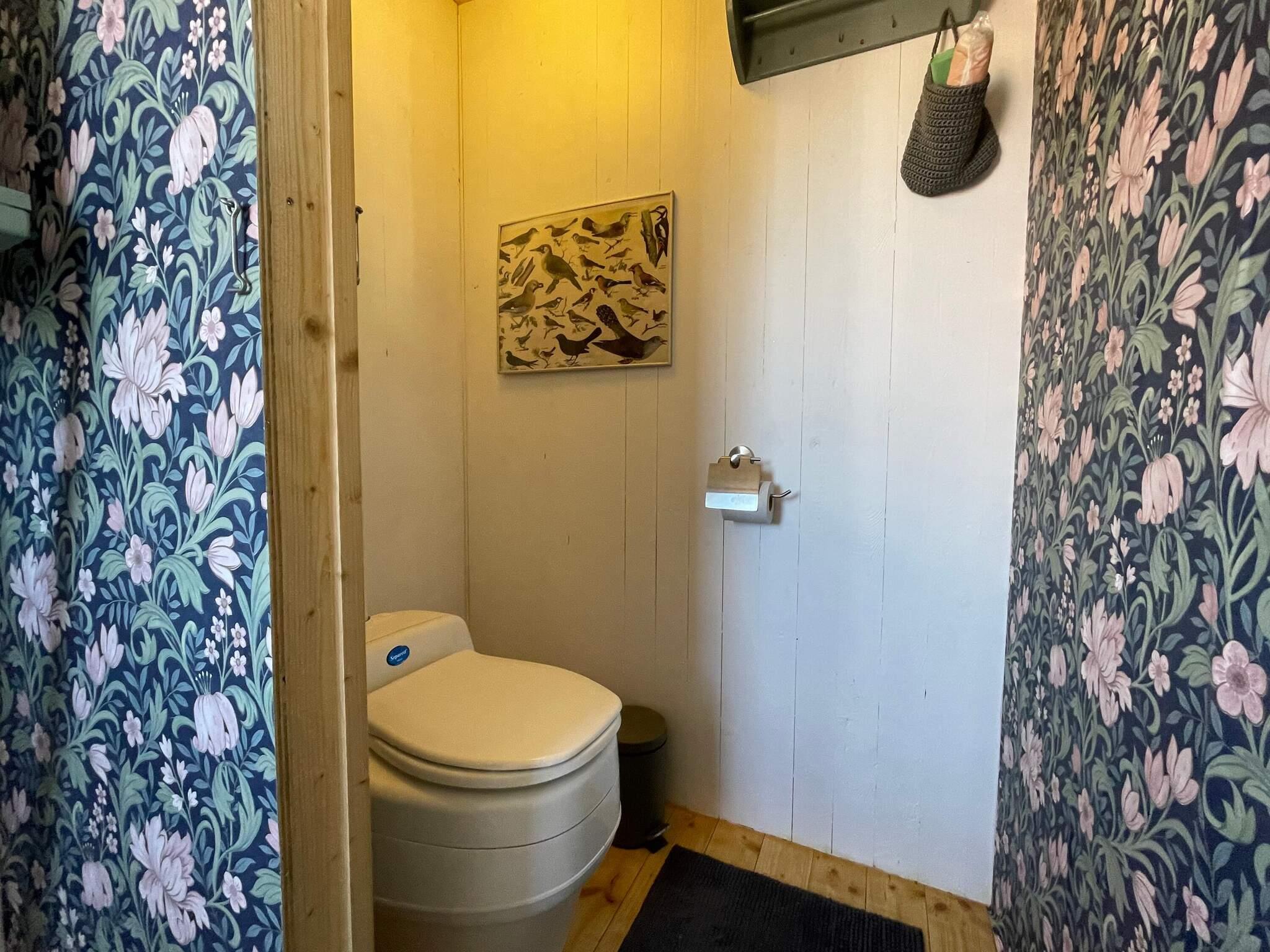 I det stora huset finns ett fräscht badrum med wc, handfat, duschkabin och tvättmaskin. I gäststugan finns även en separett som används som kan användas som natt-toalett vid behov. Separetten ombesörjs av husets ägare.