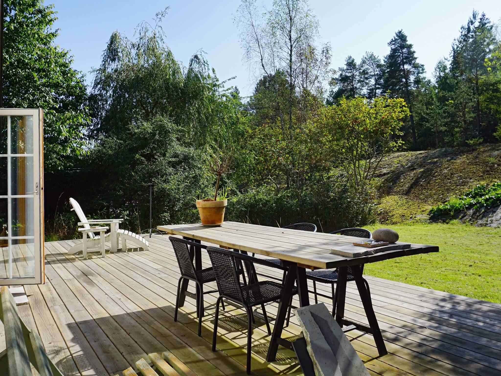 På tomten finns lekredskap för barnen i form av gunga och fotbollsmål. Här finns även uteplatser som ansluter till kök och ett större trädäck på baksidan med trevliga utemöbler och grill. Här kan ni njuta av solen länge med naturens liv som granne! Ta en kort promenad ner till badplatsen endast några hundra meter bort med en liten sandstrand och brygga. Eller varför inte bada i Svartviken, eller besöka fantastiska Skarpö – en bilfri ö med vackra promenadstråk.