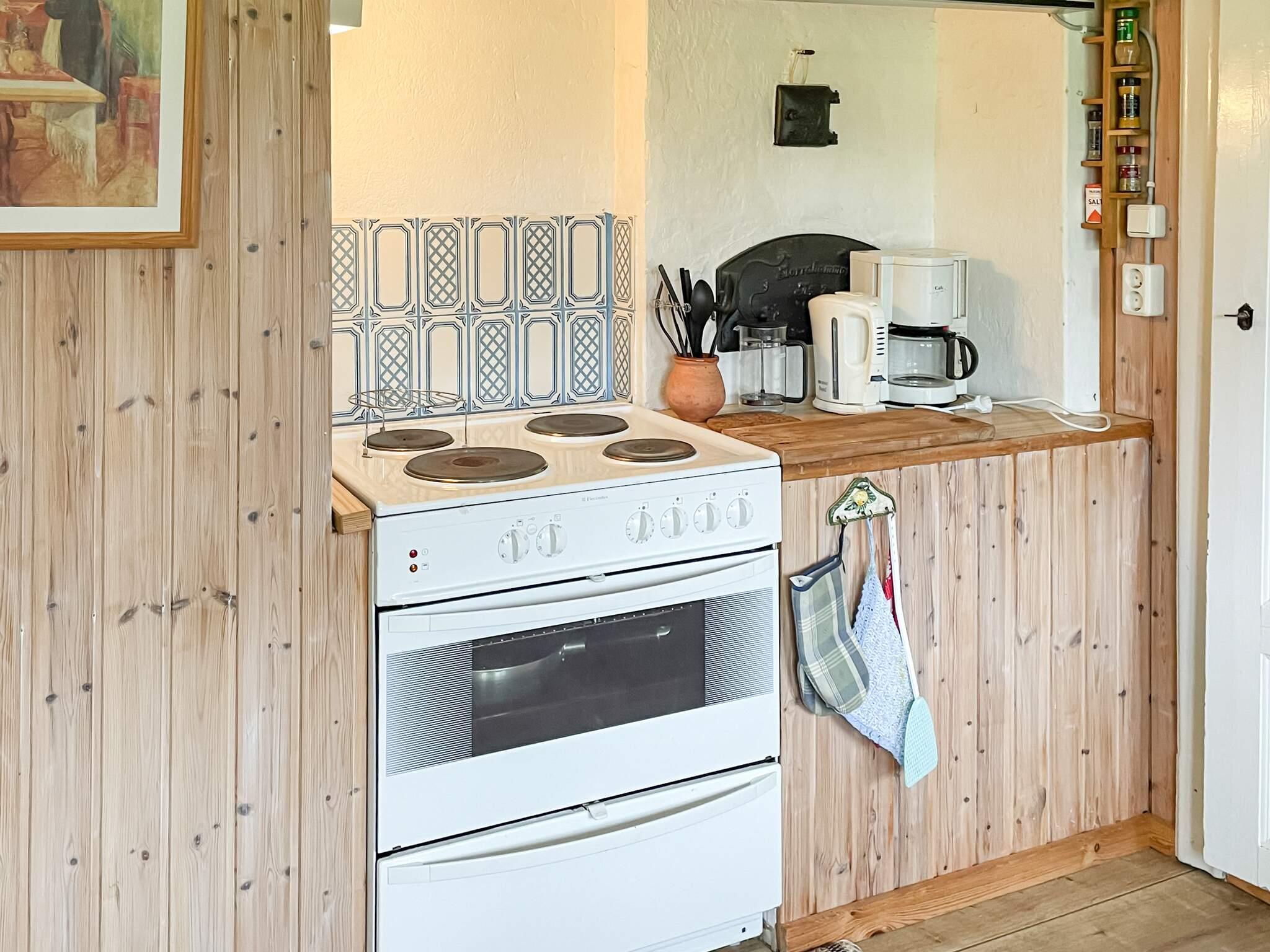 Køkken: El-komfur, køle-frys, mikroovn, kaffemaskine, vand fra brønd