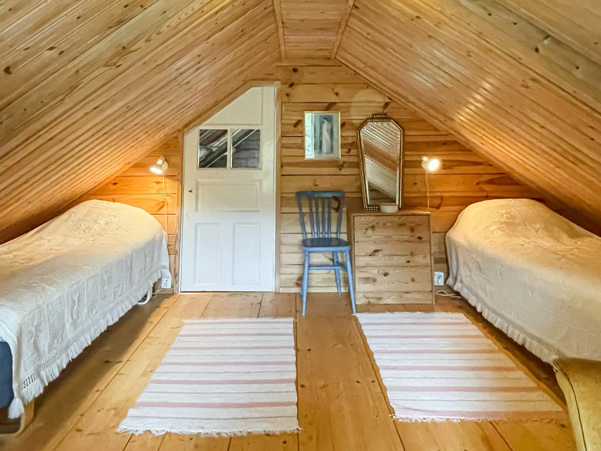 Ni sover i ett sovrum på entréplan med dubbelsäng och i ett sovrum under taknock på övervåningen med två bäddar.